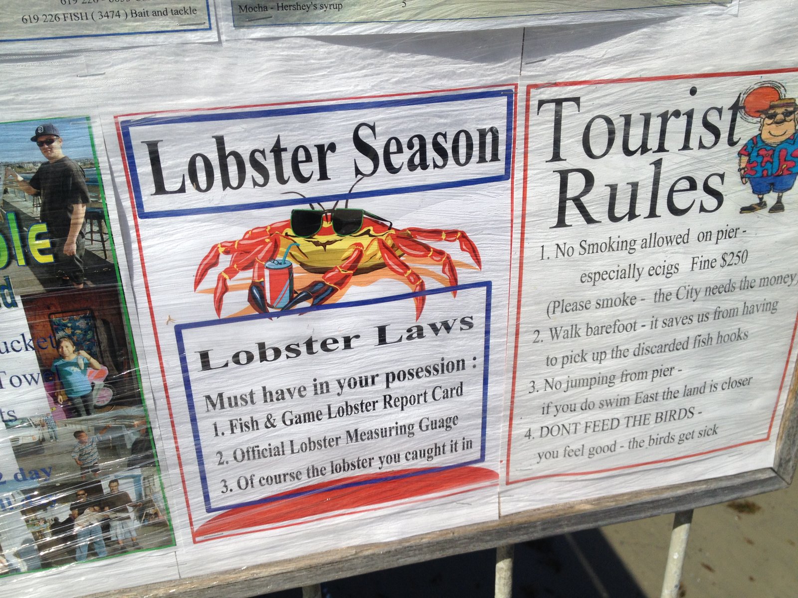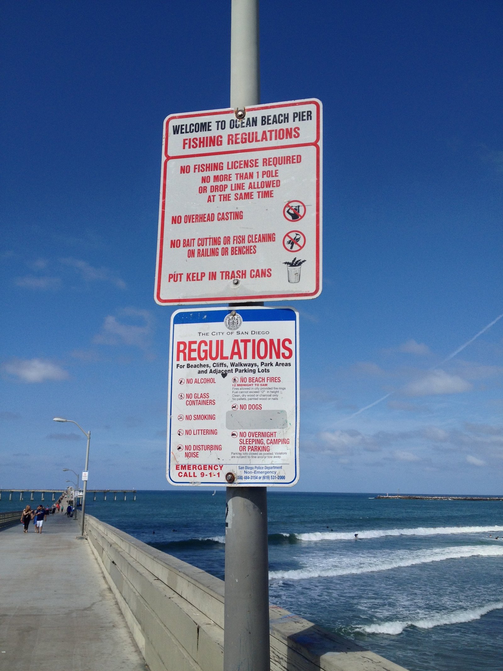 Walking up the stairs at the end of the pier, you are greeted by the gates and various signage.