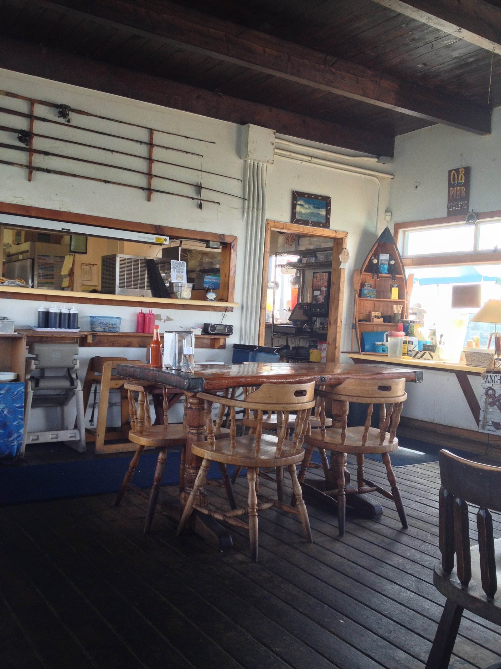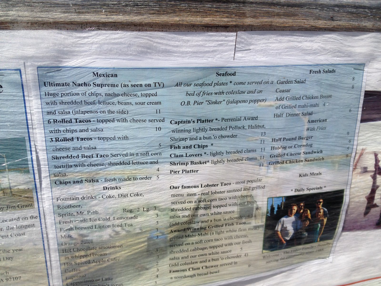 {Note: The menu states that each plate has an "O.B. Pier Sinker" (jalapeño popper) on it, which neither of our plates had, and each of our plates was $1 less than the menu price of $11.} Since it is lobster season, I ordered the lobster taco ($6) and made it a plate ($4) – with slaw and a "bun o'chowder" (instead of ordering a sourdough bowl). This was nice. Plenty of sauteed lobster meat and the topping was basically the slaw with tomatoes, sauce and jalapeño bits. The bun o'chowder was fascinating…a toasted hamburger bun topped with a good amount of house made clam chowder. The toasting of the bun meant not much absorbtion of chowder into the bread. The chowder had a great flavor, with clam bits and potato.