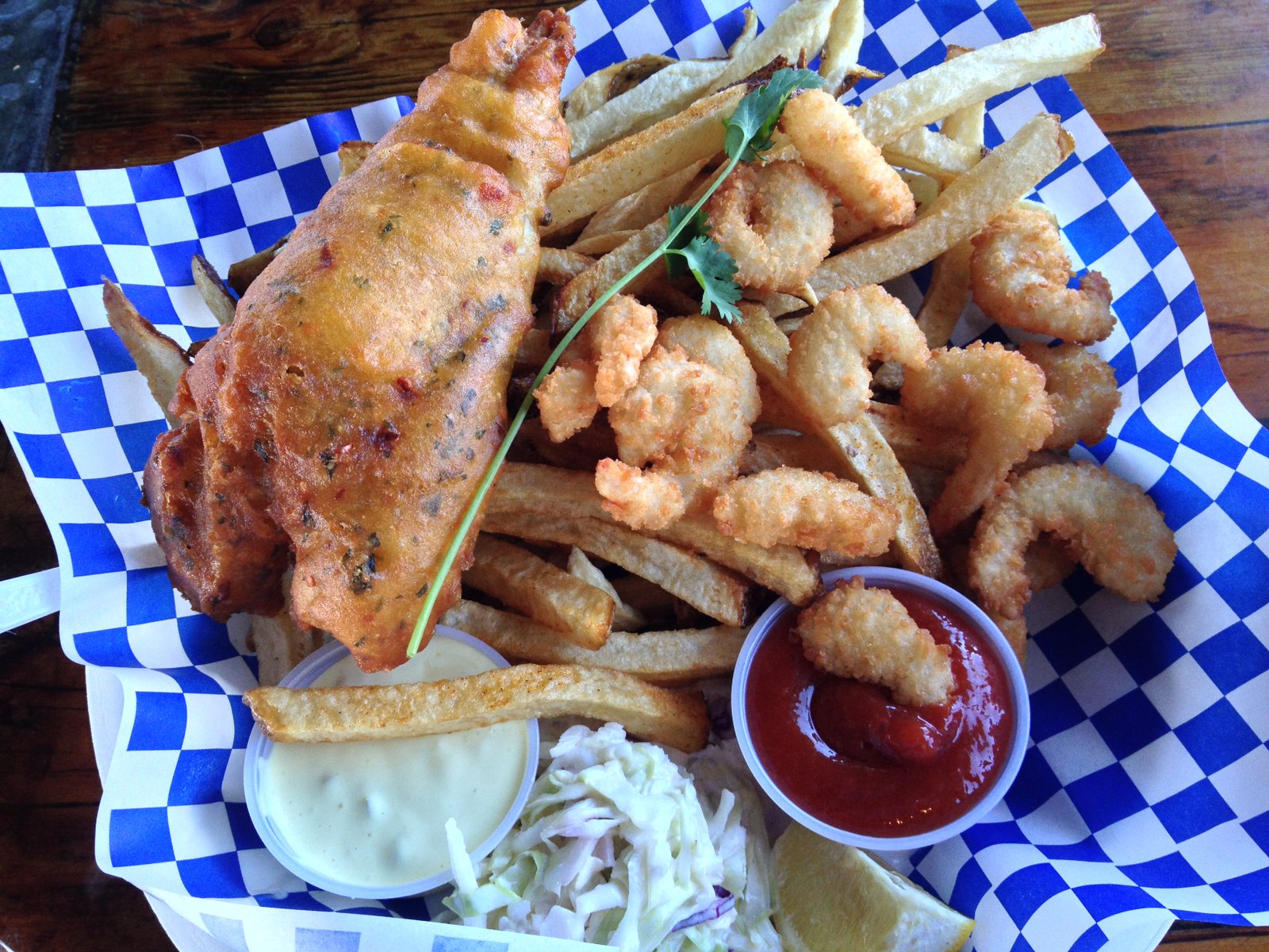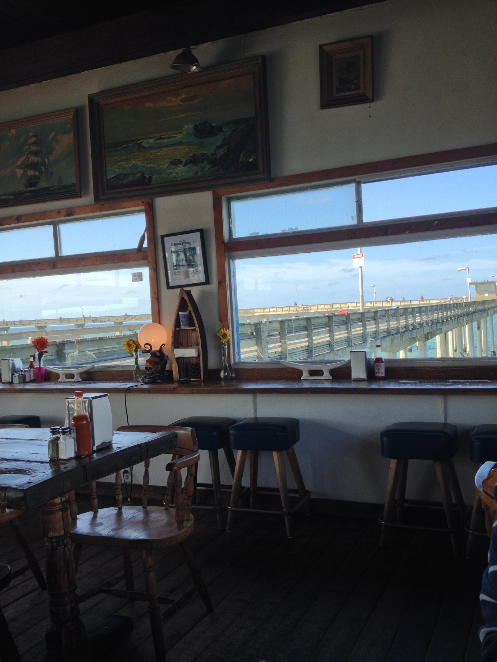 There are tables out in front as well as bar stools and a table railing on the pier opposite the doorway; plenty of seating. Indoors, there is no wind. Nautical decor, fresh flowers on the tables. The Pier Plate ($10) herb battered pollack and shrimp on top of fresh fried potatoes and cole slaw. The batter was fried properly, had good flavor; the fish was moist, thick and flaky; the slaw was fresh cut and lightly dressed (just the way I like it) and those potatoes…yes they look limp and they are limp and they have the *best* flavor, are cooked through and are wonderful!