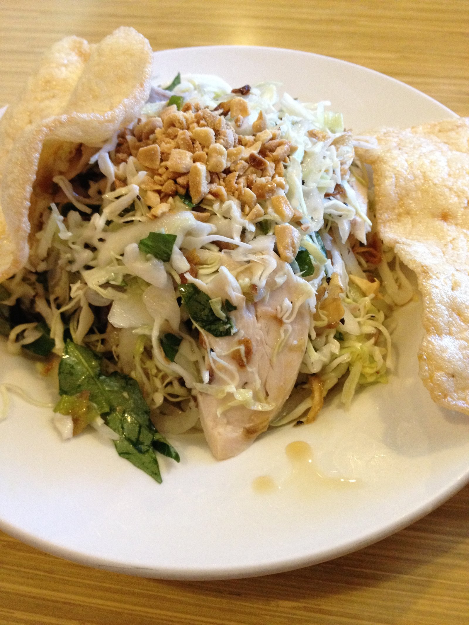 Continuing with my 'lemon beef salad' quest of the summer, I was slightly disappointed to see it was not offered here, however a lemon chicken salad (Goi Ga) ($7) was listed, so this was my order. Again, prepared differently than all the other Vietnamese restaurants. Large slices of white meat chicken cooked in a spiced lemon broth and served on crispy fresh sliced cabbage with a dressing of fried garlic, basil and topped with peanuts. This was served with shrimp chips, which just completed the flavor grouping.