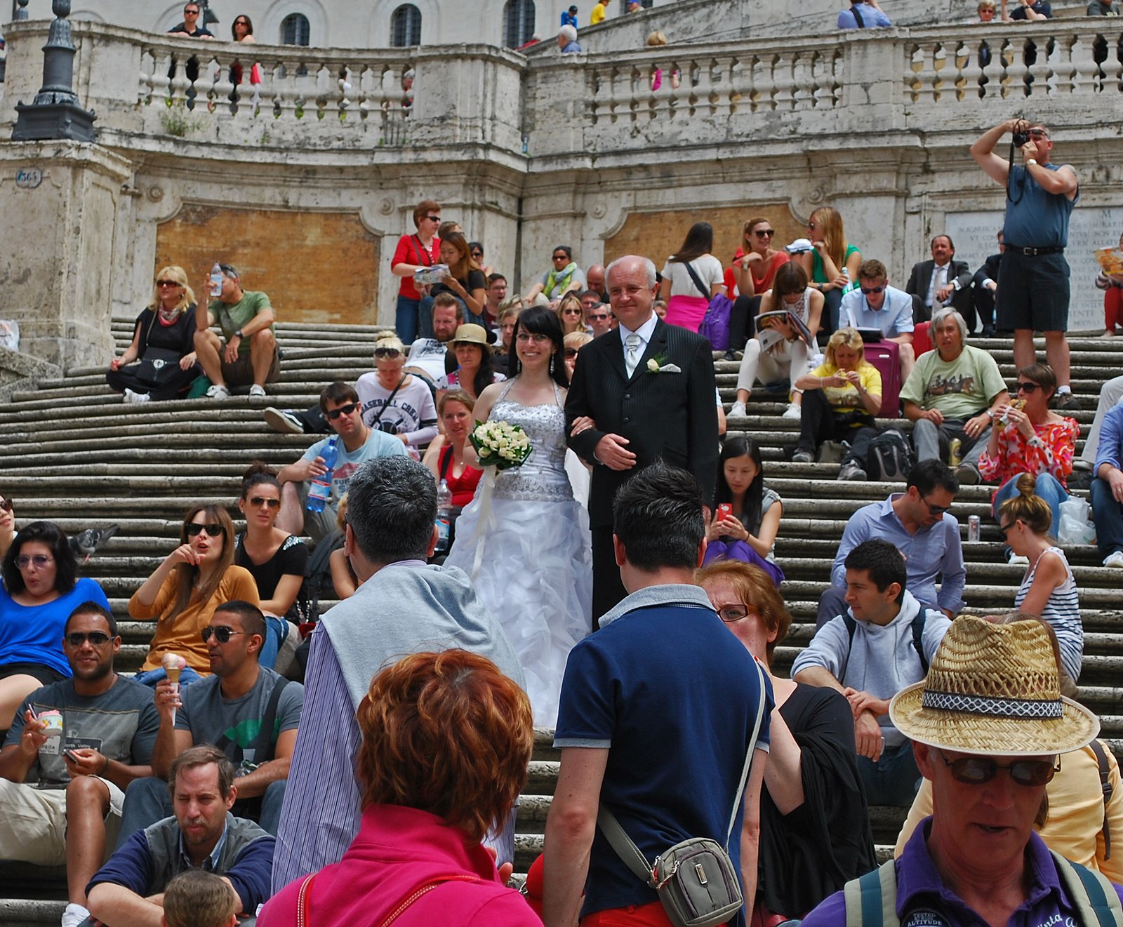 Speaking of romantic pull. Look closely in the photo above…..do you notice the young woman in the wedding gown and the older man, whom I'm assuming is her father in the suit? Here have a closer look….it seems they're shooting wedding pictures? Along with several thousand absolute strangers…..kinda strange, but kind of well, cute in a way.