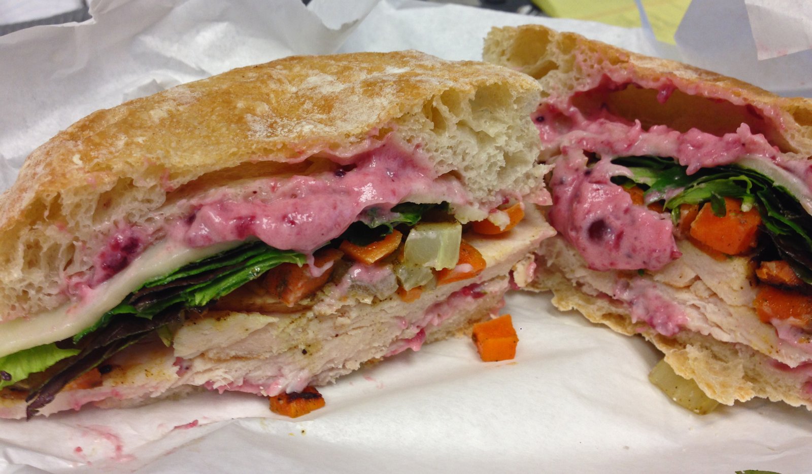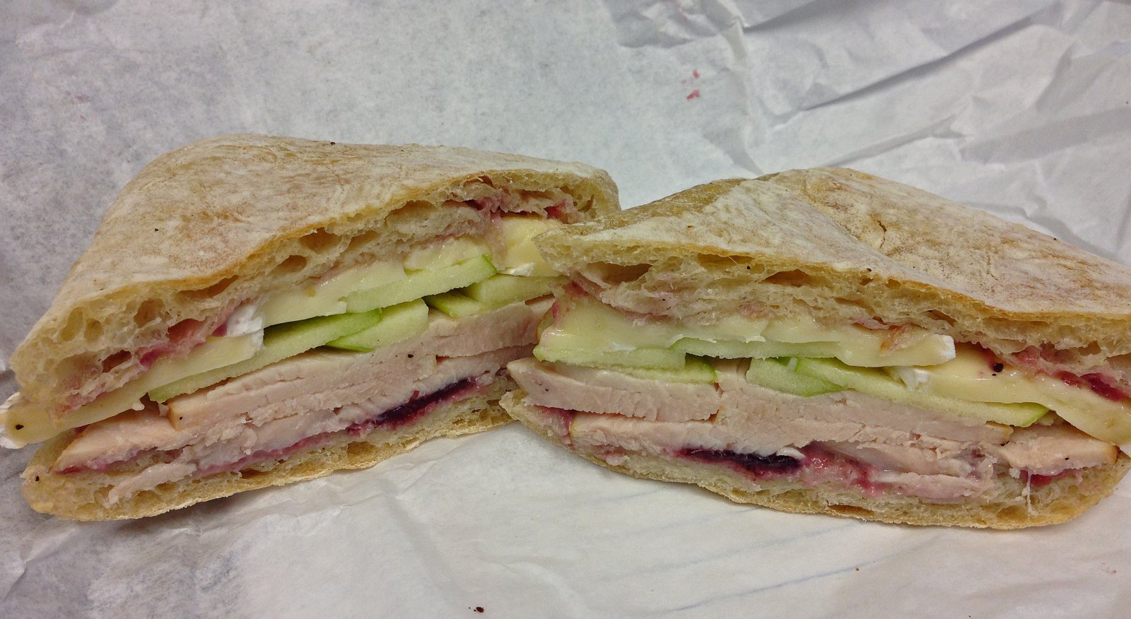The "Brie" was my favorite of the two, though it's a bit too tart, the combination of of Granny Smith apples and cranberry kind of over did that for me. But if you like that flavor profile, you'd love this. I though all that tartness cancelled out the brie. Same deal as before with the ciabatta…the turkey is formed, but not processed….that is; they cut it from a round "roll"……it still was undoubtedly turkey.