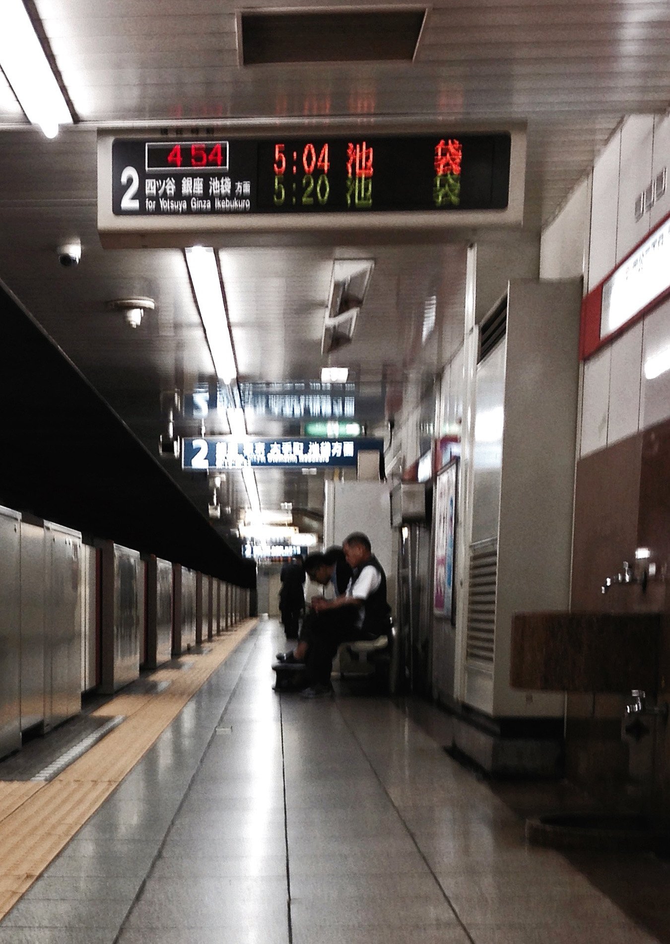 We had spoken to several folks; Reiko and the couple while having coffee near Tsukiji. They mentioned missing the "last train" out of Tokyo and having to stay up in a coffee shop to catch the first train out in the morning. And the young ladies here seemed to be a prime example of that.