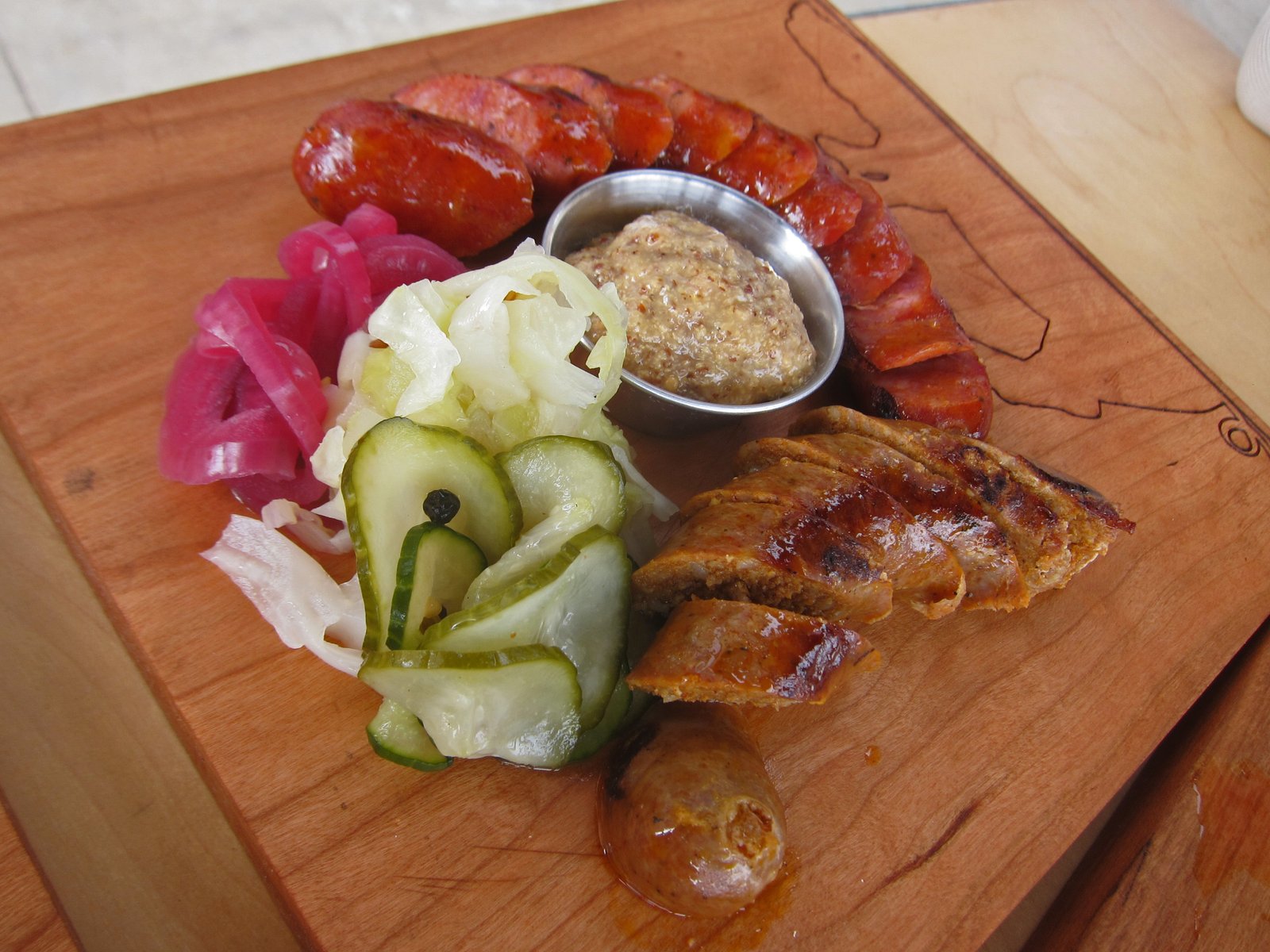 The Smoked Beer Bratwurst was very bland. The Bacon Cheddar Jalapeno was quite nice, not too sharp or spicy, a very nicely put together sausage. The Smoked Spicy Cajun had a nice kick, but was really salty and I didn't like the casing on this one; it was too tough. We enjoyed the Linguica, a bit on the mild side, but the flavors went together well. The mustards and sauces were fairly routine.