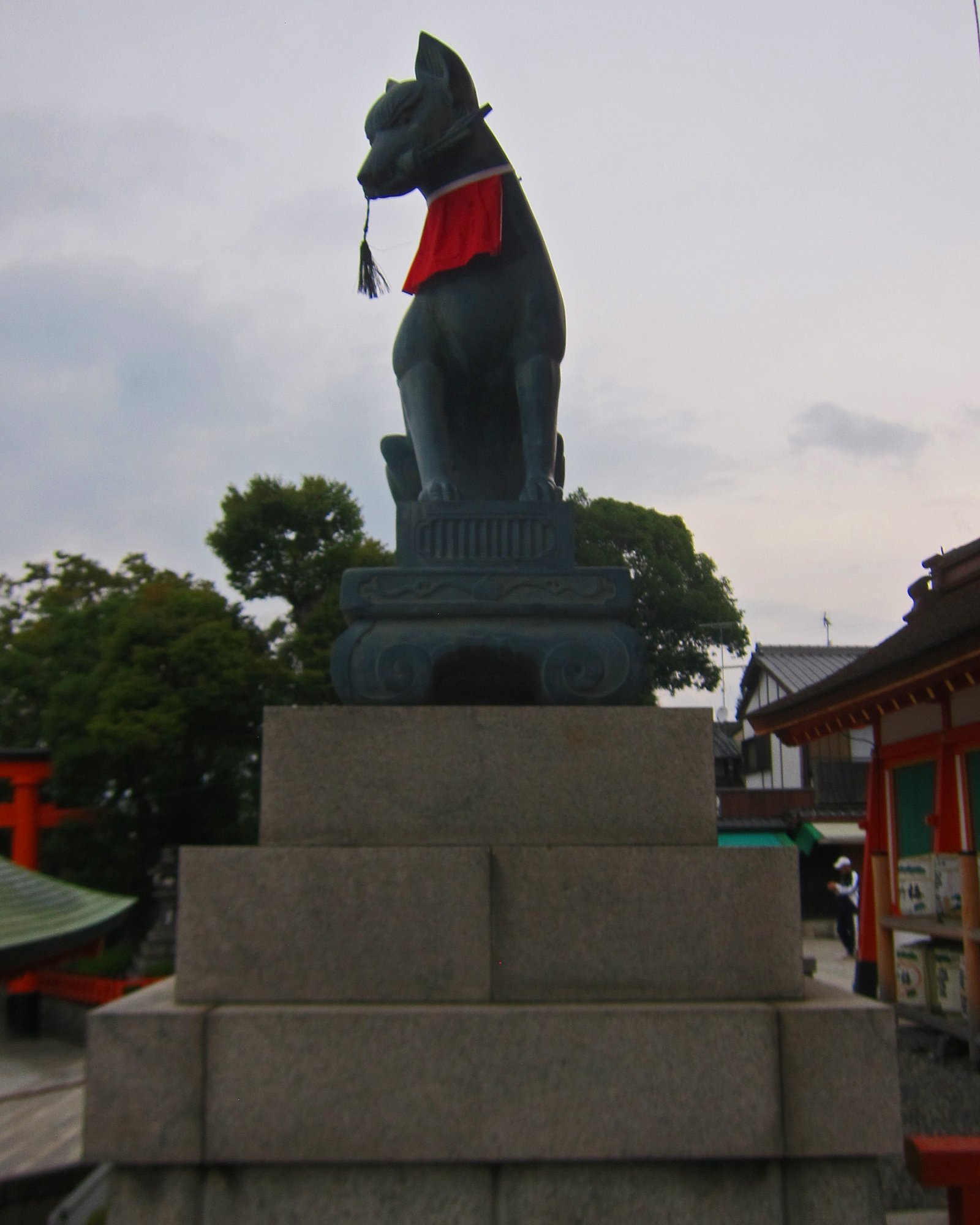 Fushimi Inari is the head shrine of Inari Okami, the Kami…..which is hard to describe in English, let's just say it's the spirit, god, or deity of most importantly, rice, but also fertility, sake, and foxes…… which, if I recall serve as messengers for the Kami. At the entrance of the shrine, you'll see a statue of a fox (no, it's not a "doggie") holding the key to the granary. I remember learning about the kitsune serving the rice god in elementary school….funny what you recall at odd moments in life.