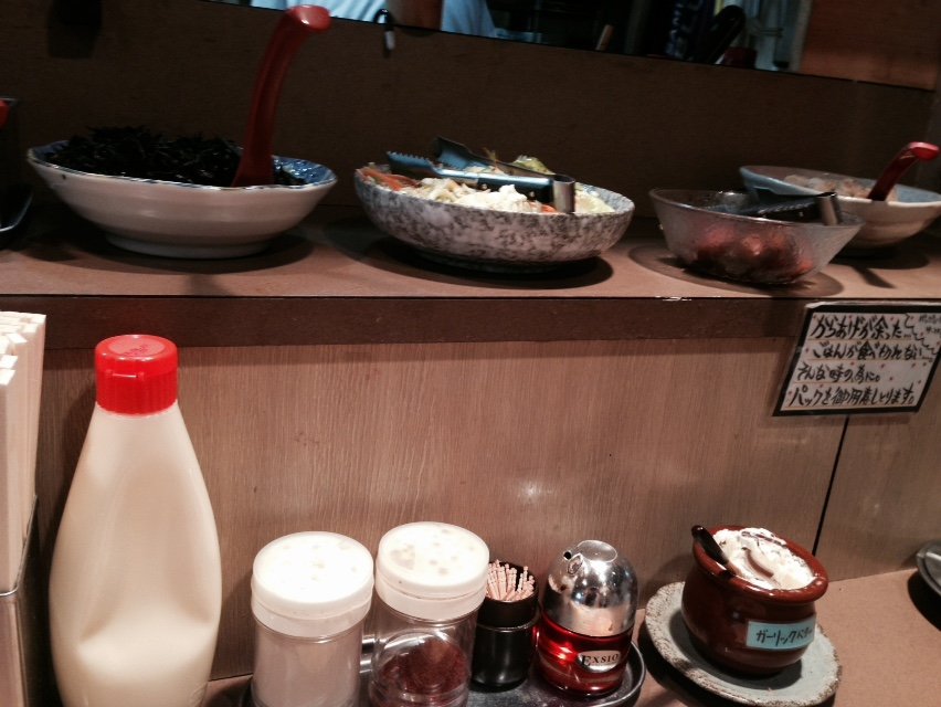 We quickly placed our order and he spoke the only English I heard our whole time there, pointing to the hijiki, tofu, and green salad on the counter he said, "helpu you self….."