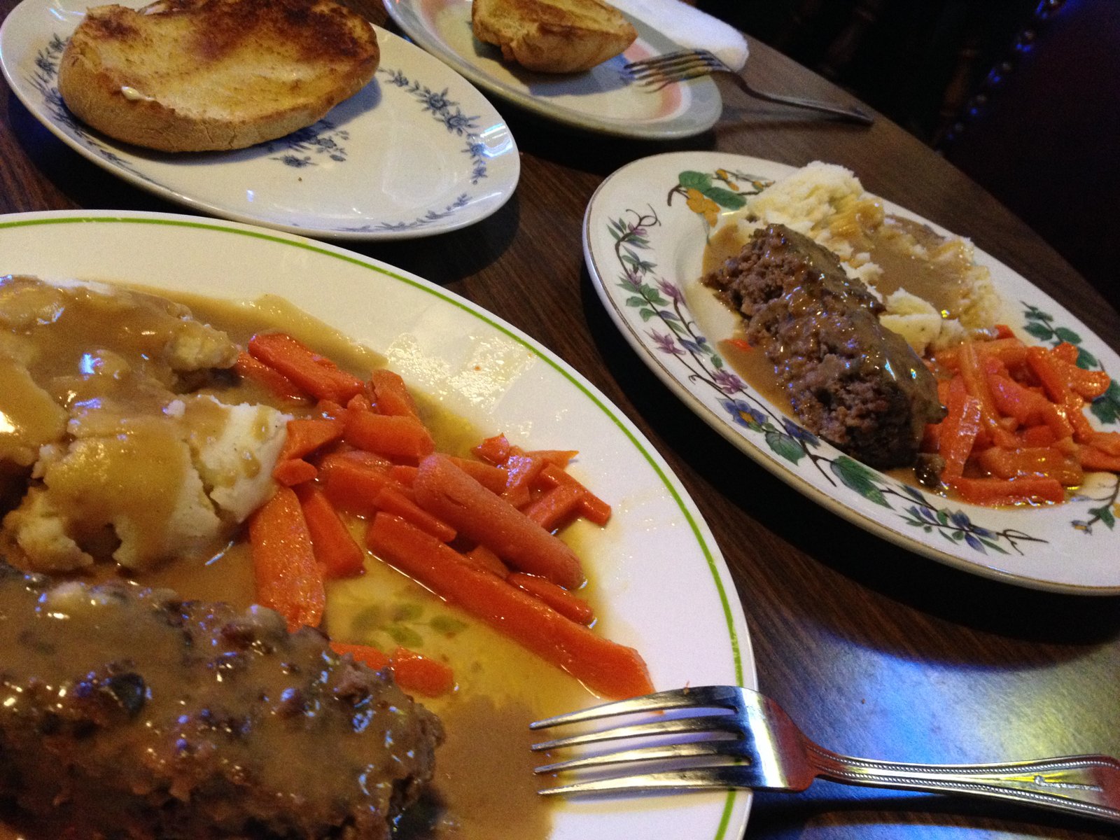The $5 meatloaf plate. A good two inch thick slice of meatloaf, made with a mix of beef and pork, green pepper and other flavorful (not too salty) ingredients and served with a side of mashed potatoes, fresh vegetable, lots of gravy and a toasted roll half. A perfect comforting meal,