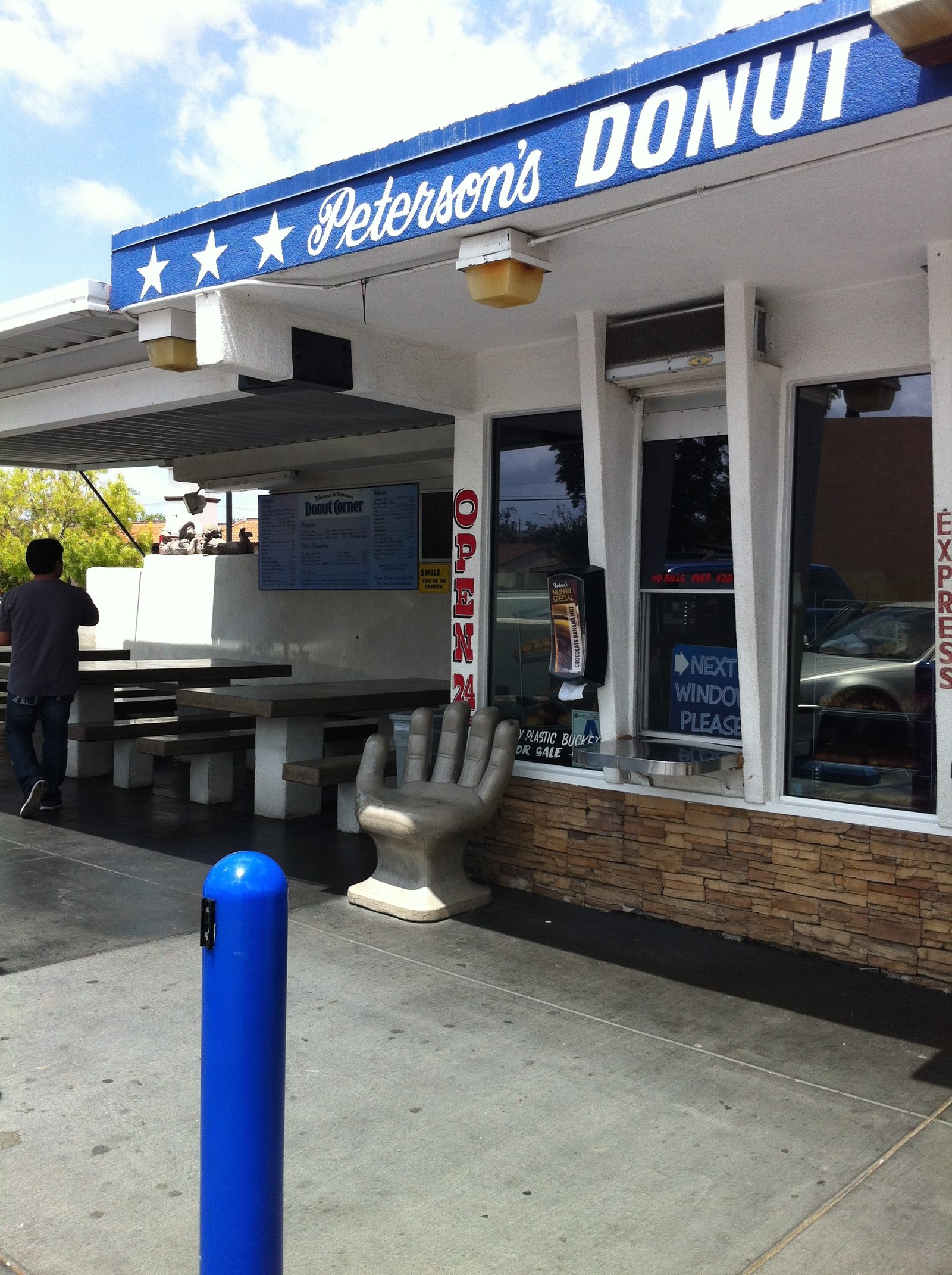 Looking back, I've only made slight mentions of Peterson's Donut Corner (in the middle the Ham and Cheese baked in a bread compendium post and in the Elephant in the Room post), a San Diego County Institution since about 1942. So, here's a solo post. (Here's a link to cc's post, Mary's post, Kirbie's visit and Darlene's posting)The Southwest corner of Escondido Boulevard at Ninth is where you will find Peterson's. All outdoors-you can see a menu with prices near the cement picnic tables, which are across from more giant hand chairs. You're going to walk up to one of the three windows, order and pay (cash only).