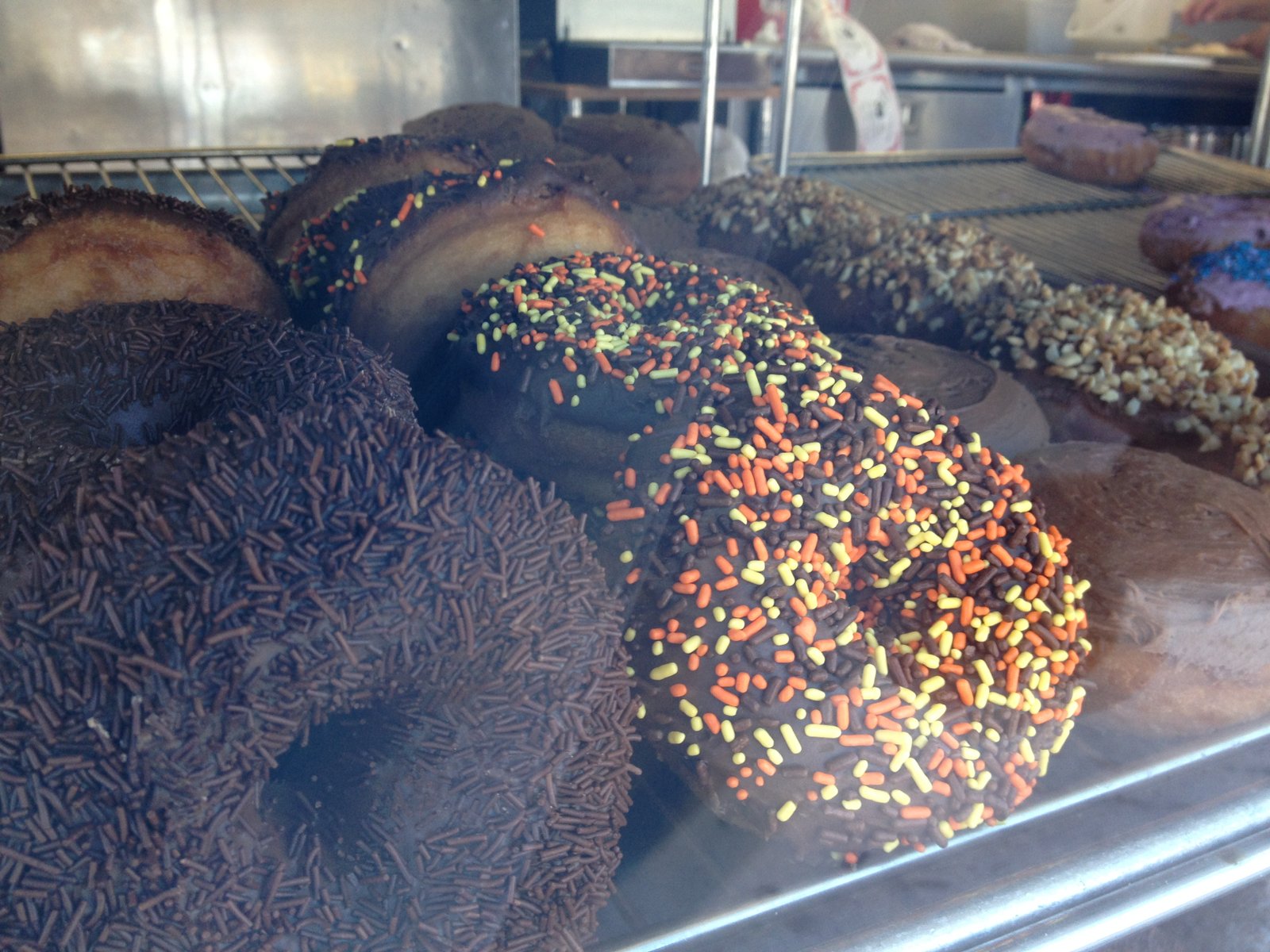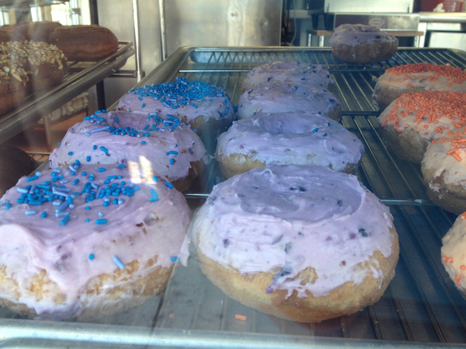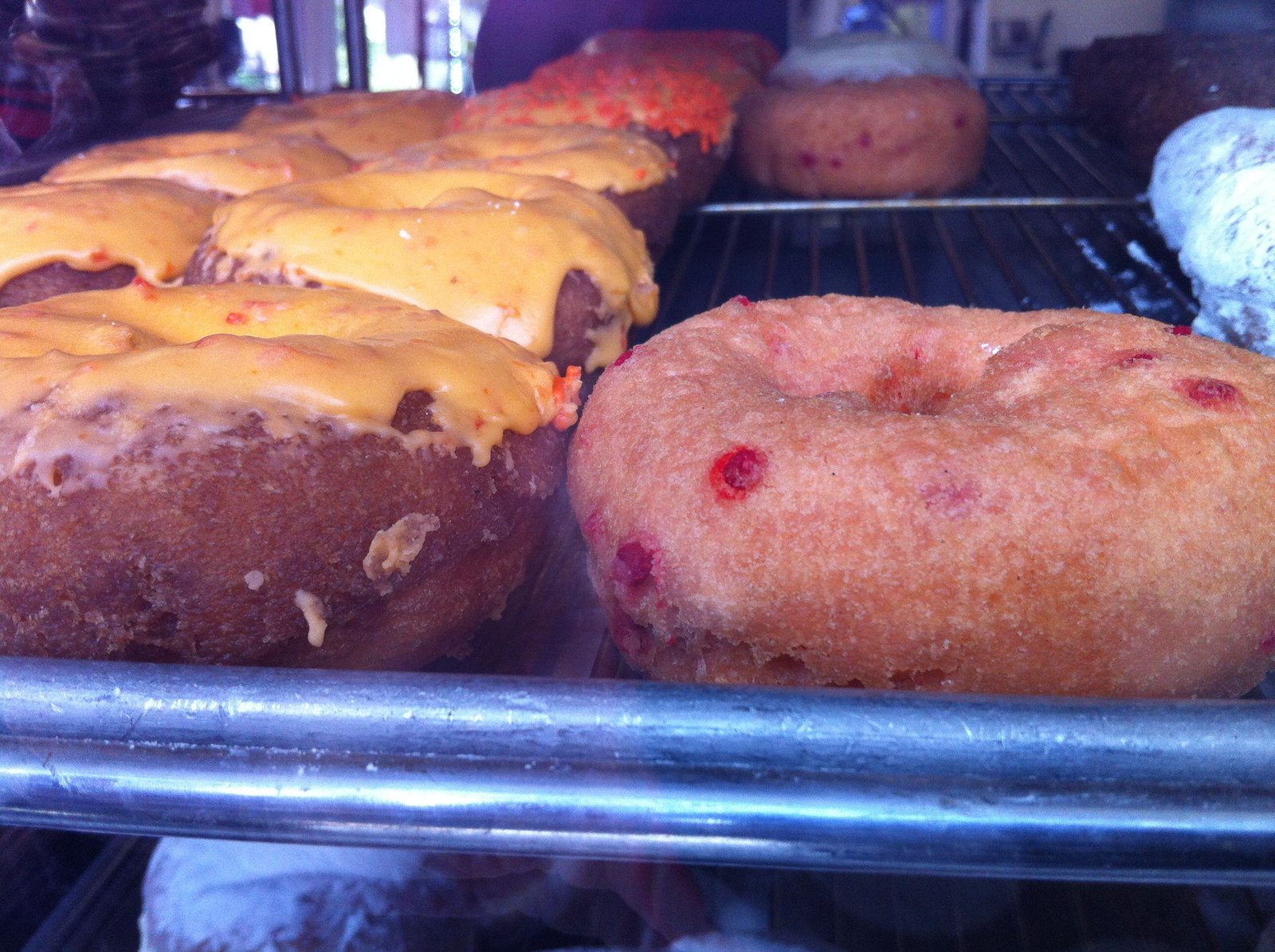 I've been on an orange donut quest for a good part of the year. The Mister and I had had donuts with the dough interspersed with orange peel in Italy, decades ago and orange has been a familiar, comforting flavor for me. The orange peel is only in the frosting on top of a cake donut, and very good, but not what I'm seeking.