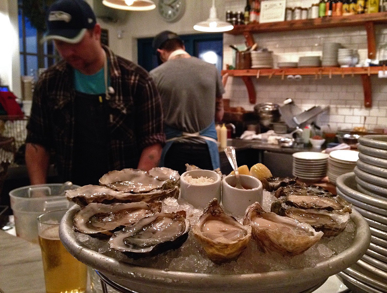 It was 345, we'd done pretty good time, about 35 minutes. We were the third party in line(no reservations at this small place)…not bad. I went down the stairs to the restroom, following one of the guys who exiting the restaurant. I was a bit wet and somewhat sweaty from the walk and the drizzle. The guy asked looked at me and said, "drizzling down a bit out there?" I told him that it was a combination of things since we walked here from Pioneer Square, via Fremont. "You what? "I heard that this was where we needed to come for oysters…." "Ok, then, you'll be happy, we got some good oysters tonight." Nice guy! I got myself a bit more presentable and headed back upstairs.