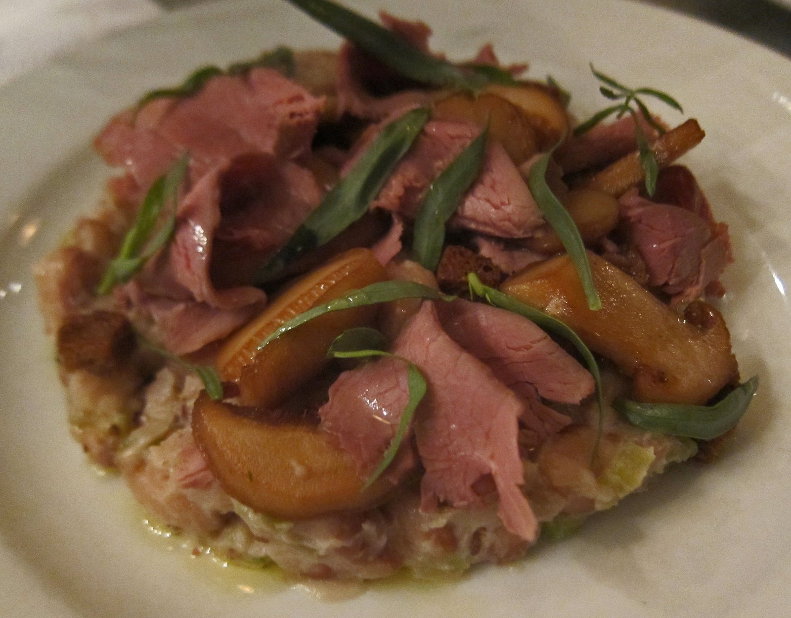 Meanwhile, our first garde manger dish arrived; the Duck Breast, rockwell beans, masutake mushrooms, sea wolf croutons, and tarragon.