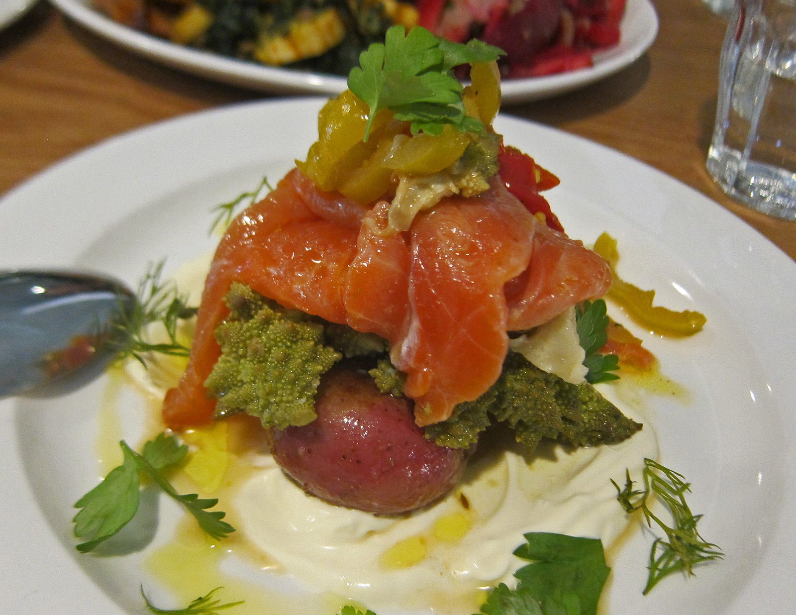 Of course the Missus loved the romanesco……..but was less than impressed with the rest of it. Deconstructed; the potato is the "bagel", the pickled peppers the red onion and capers, and the creme fraiche….well, creme fraiche. I would love a bit more dill and something more herbaceous to set this off. Not a bad dish by any means….but while carried out well, quite mundane.