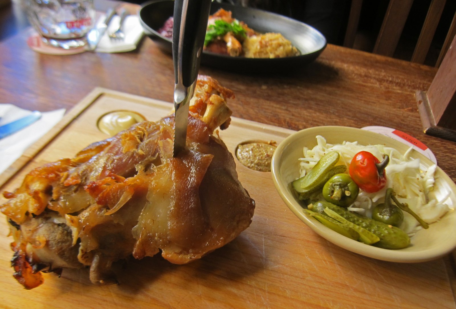 I saw the roasted pork knuckle on the menu, the price, something like 260 CZK, about eleven bucks sounded right. I was amazed at what arrived at the table…..holy smokes.