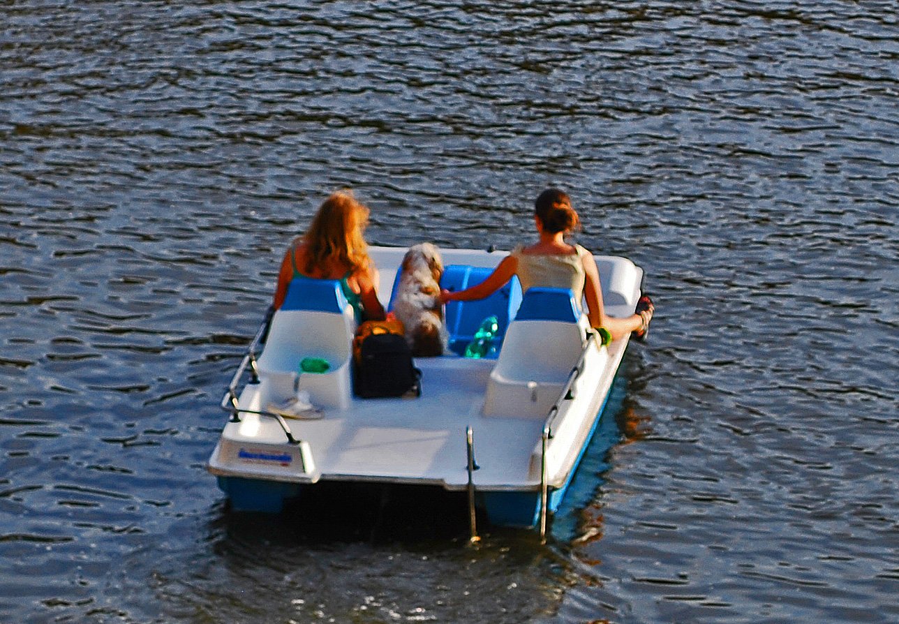 Two women, faithful canine in tow, heading off into the sunset in their paddle boat. This just seemed the perfect time to call it a day……time for us to head off and think about the next stop on our trip.