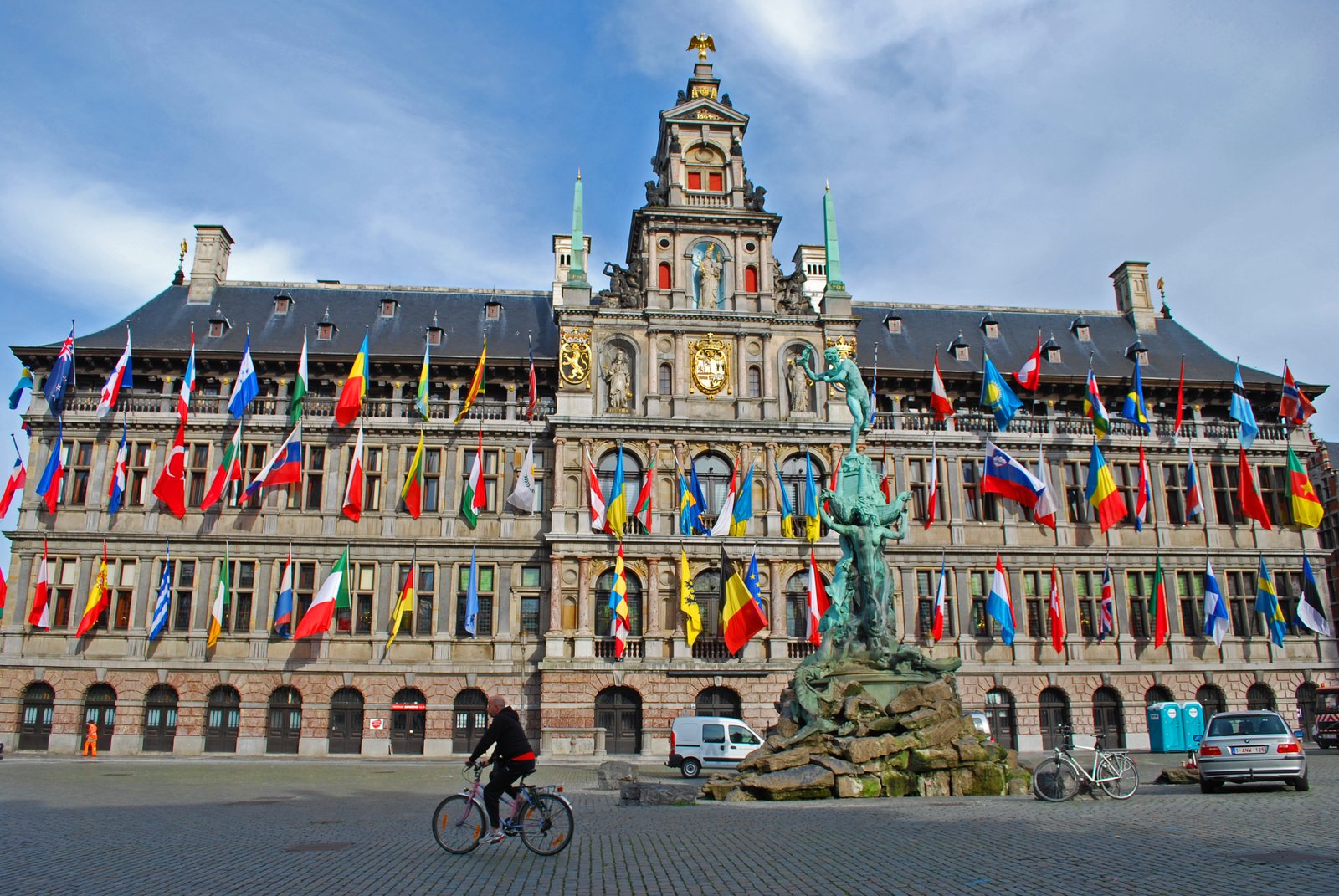 The Grote Markt is lined with Guild Houses, each one topped with a gold statue or emblem. The City Hall, adorned with flags of different nations really stands out. As does the interesting fountain in the center of the square. Is that really someone throwing a severed arm? You bet….. The Brabo fountain depicts the end of the legendary and feared giant Druon Antigoon who guarded the Scheldt River the main river that flows through Antwerp. The giant would demand a toll for anyone crossing the river. If he was refused, the giant would sever the hand of the person and throw it in the river. Silvius Brabo a Roman soldier vanquished the giant and severed the arm of the giant, flinging it into the river.