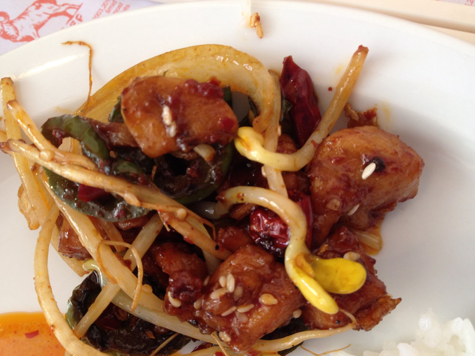 Above, Chicken with Green Chili and Hot Sauce ($8.99). Red and green bell peppers, a spicy fresh green chili (looks like a jalapeno but it isn't), dry red chilis, garlic, black beans and plenty of chicken. This is delicious and so very fresh.