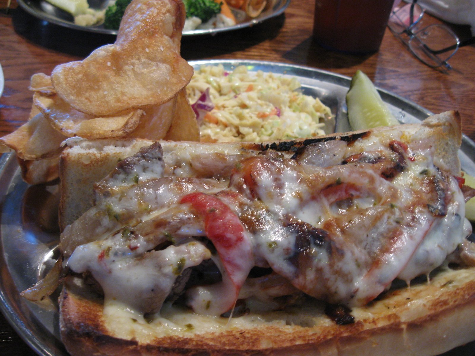 All of the sandwiches and many of the entrées come with one or two side dishes, so let's start with sides. The healthiest side is the grilled mixed vegetables, crispy tender and lightly seasoned, here pictured next to the decent thick chips which are served with many of the sandwiches: