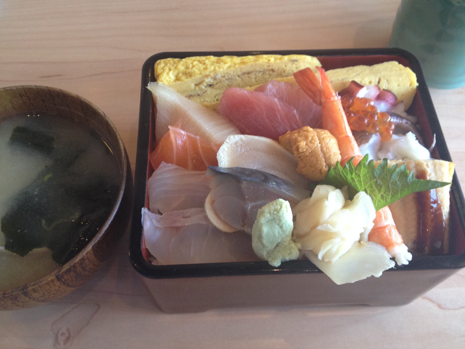 The very large Chirashizushi ($18) had the bottom of the box filled with an *excellent* sushi rice and topped with whole sashimi pieces. The variety of everything that was fresh that day and just perfect (the saba (mackerel) and sea eel were particularly great). Our waitress mentioned which items had been flown in from Japan.