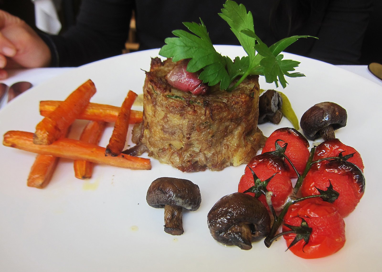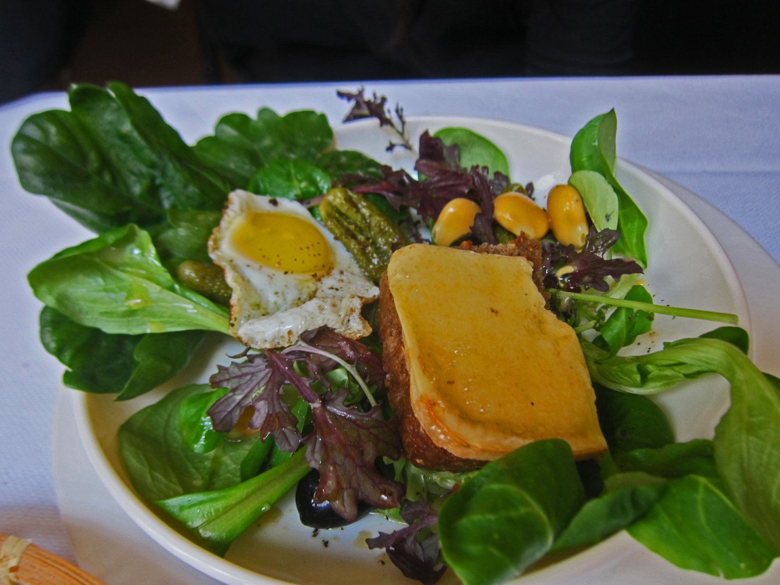 The Missus of course, got the Parmentier de Carnard, which started with quite a sizeable salad. Dressed simply, topped with a quail egg, after days of hearty, hefty, meals in the Czech Republic and Antwerp, was something She really enjoyed.