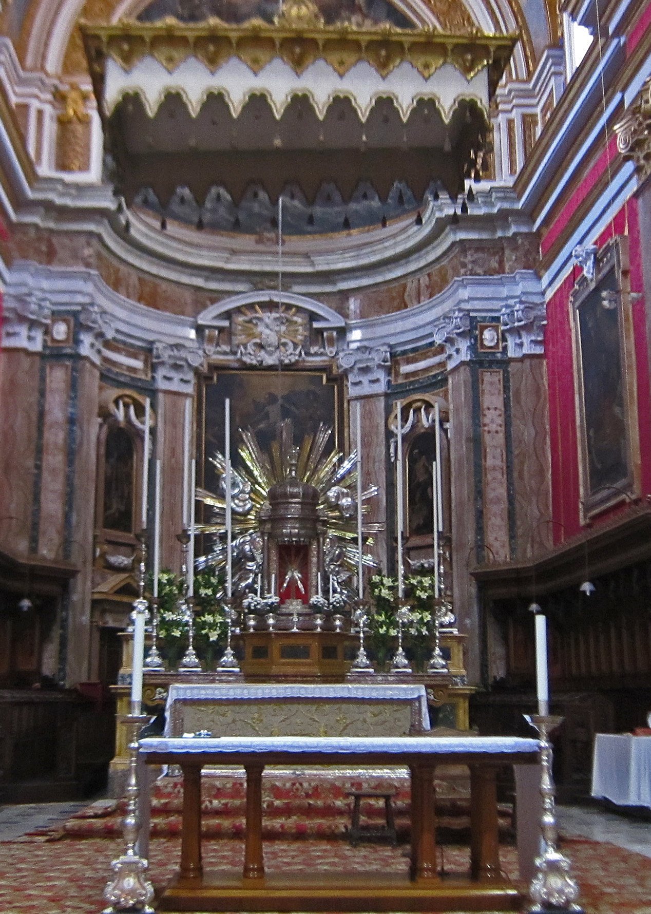 Most street were busy, though not extremely so. Another one of our favorite places was the Carmelite Church and Priory. The monks of this priory follow a strict rule of separation from the external world. In other words, it's a cloistered order. We were told that the monks still live in the buildings and above the priory. It's an interesting view into a different world and definitely worth your time if you're in Mdina. During the French occupation, all the silver was removed from the church. In September of 1798, the French returned to finish off the job. The story goes that a young boy climbed to the top of the belfry to sound the alarm and Maltese Rebels locked the doors of the church, starting the Maltese Revolt.