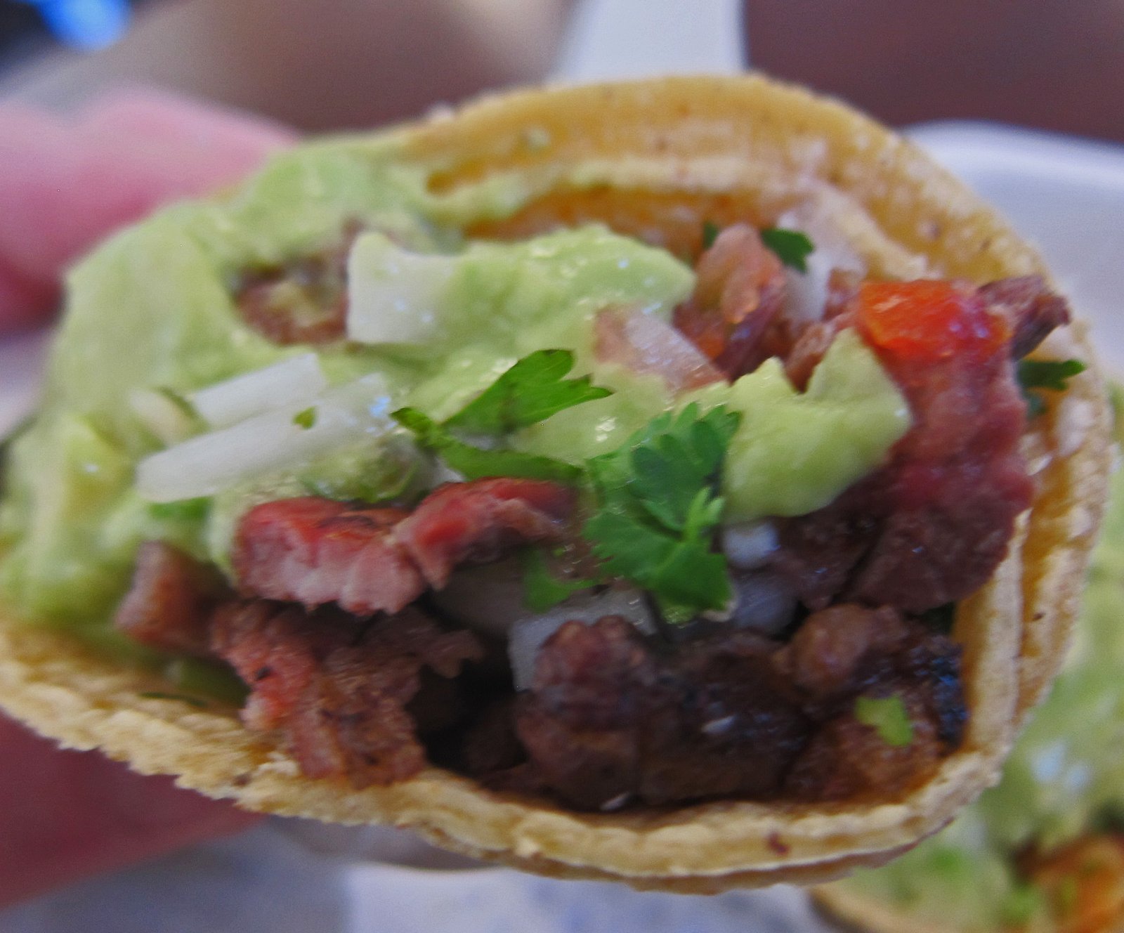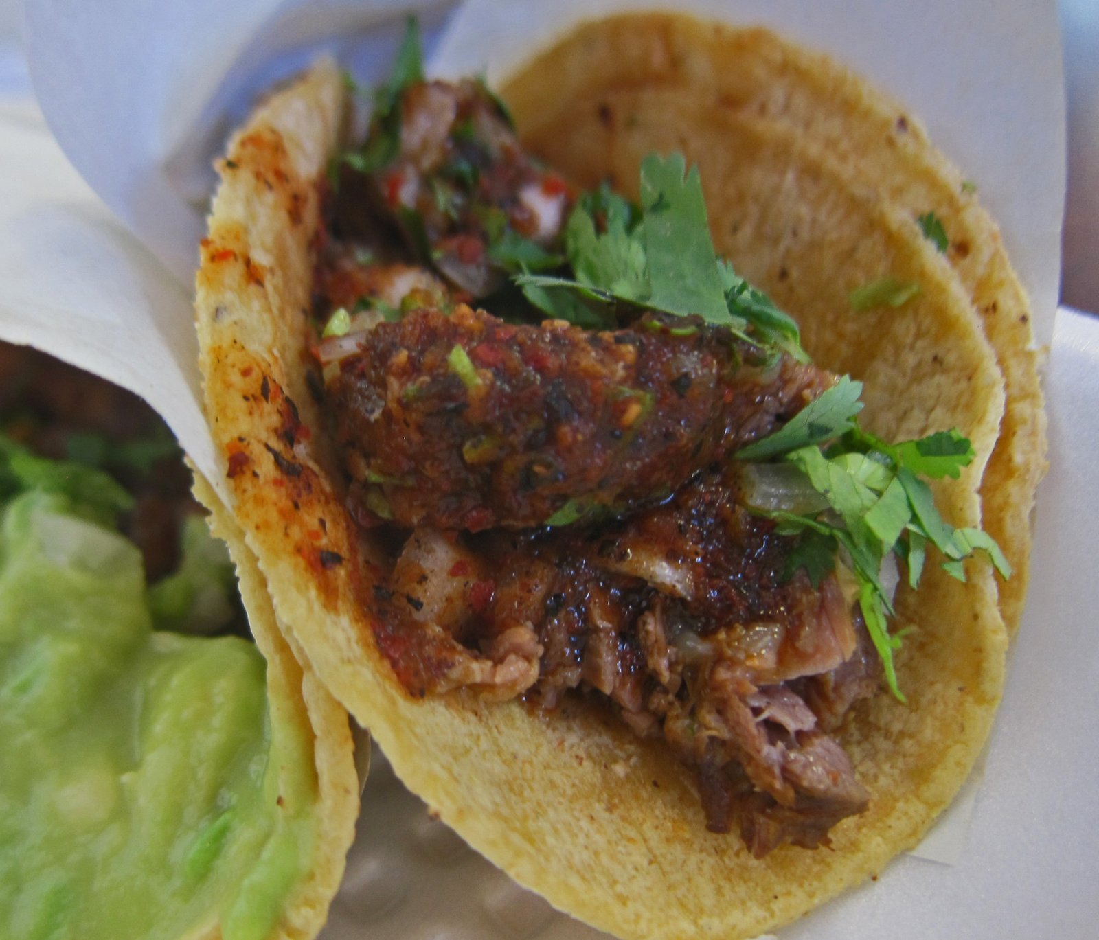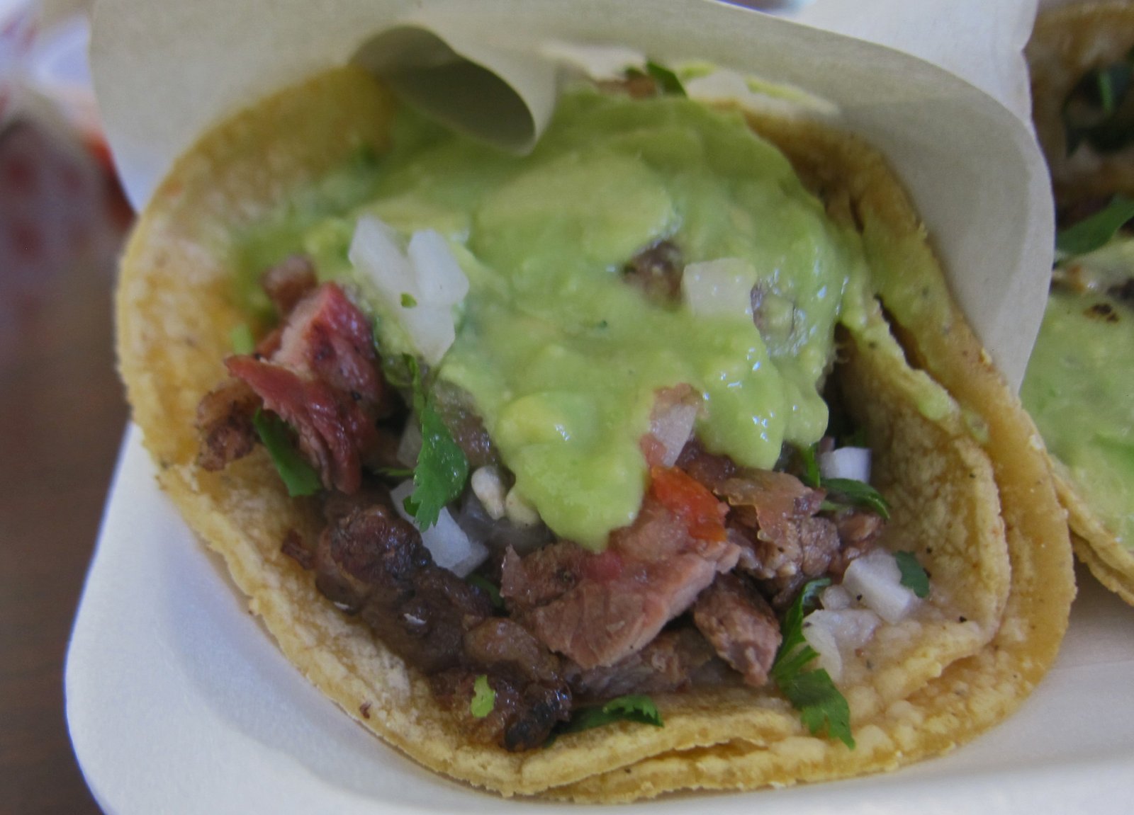 The adobada was better, a bit more flavor, but still too dry and bland for me. I like my adobada to have a nice salty-savory-sweetness which the Missus says is "like good char siu". The guacamole does real well on this one.