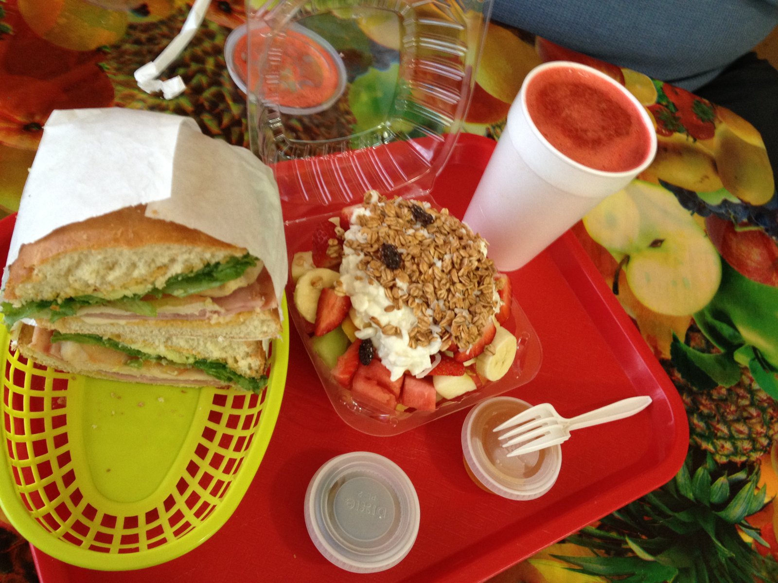 Our order consisted of a medium Vampire juice (beets, carrots, celery and apple), small fruit salad of what was in season (strawberries, bananas, watermelon, green apple) topped with cottage cheese and granola with a side of honey and a mixed meat torta. The total bill was $12.