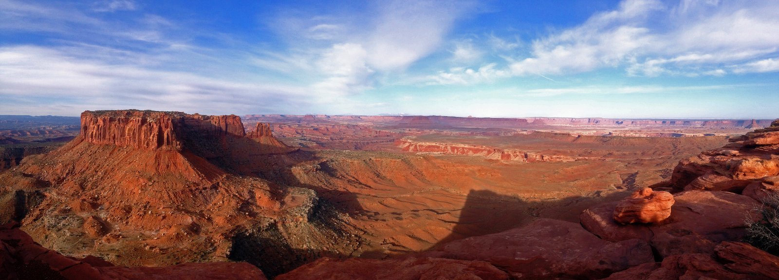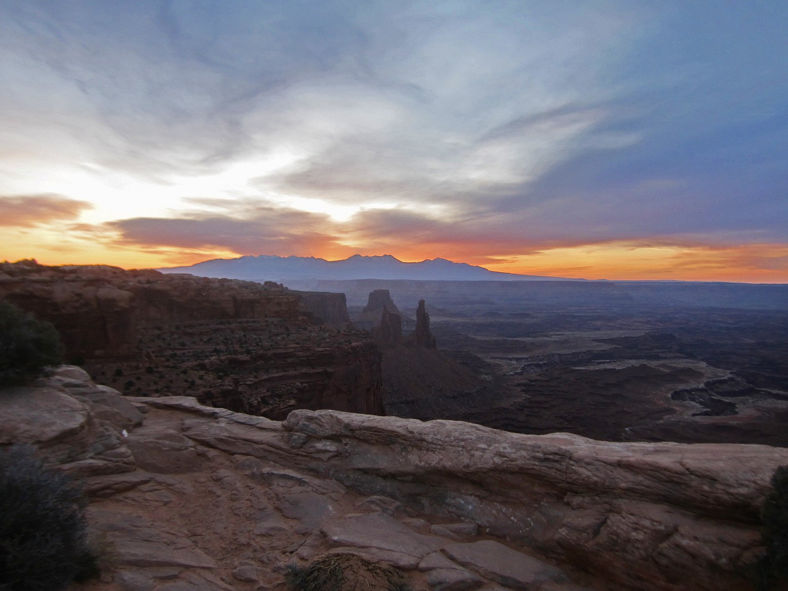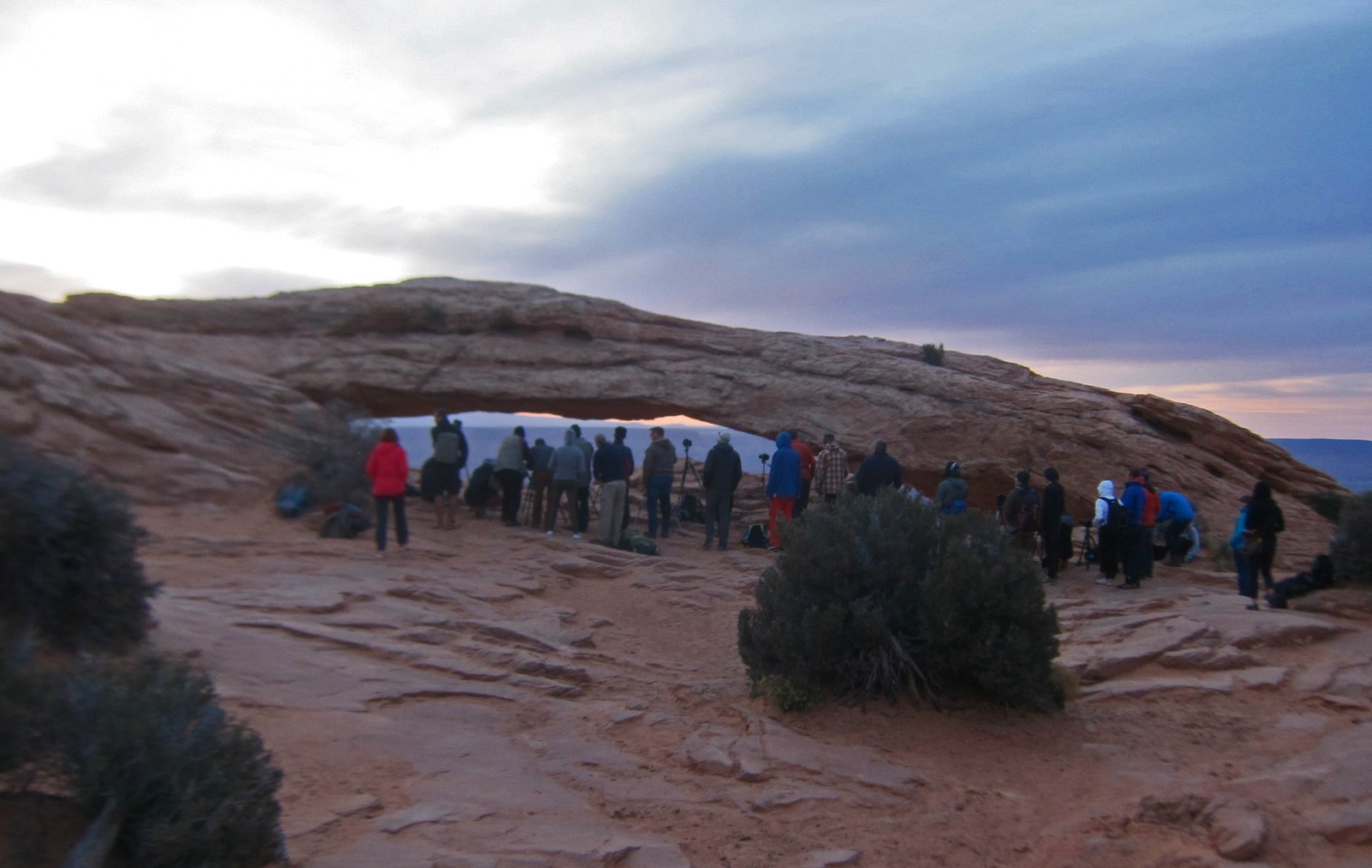 I woke at 530am on our second morning in Utah. The previous day, had been quite amazing….well, the views, not the food. We decided to head off to a district of the massive (337,598 acres) Canyonlands National Park, known as Island in the Sky, a mesa that towers a thousand feet over the rugged and picturesque terrain below. I got the Missus up at around 6am….we showered, packed up and headed out into the dark morning…..pretty much like the day before. This time though, our target was much closer, a bit over 30 miles or so away. The classic location for viewing the sunrise in the Island in the Sky district is the Mesa Arch which frames the East rising sun. We had run into maybe two cars on our drive to the Mesa Arch, but were surprised when the parking lot was almost full! Taking the short half mile walk to the arch, we could see an entire line of paparazzi folks with camera gear already set-up!