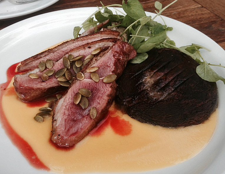 Funny thing; several items seemed in need of salt…which led the missus to say, "hey, this is SALT Lake City, right?" The duck, with a light sprinkle of salt tasted fine. It was cooked a nice medium rare. It was cut a bit too thick. also, the plating seemed a bit dated and ponderous. That red stuff you see on the butternut squash puree is actually duck blood……I don't think the duck rested long enough after prep. Loved the upland cress, peppery and refreshing. The Portobello was totally under-seasoned and the gills hadn't been cleaned, so it left a huge black blotch in the orange-blood tinged, plate.