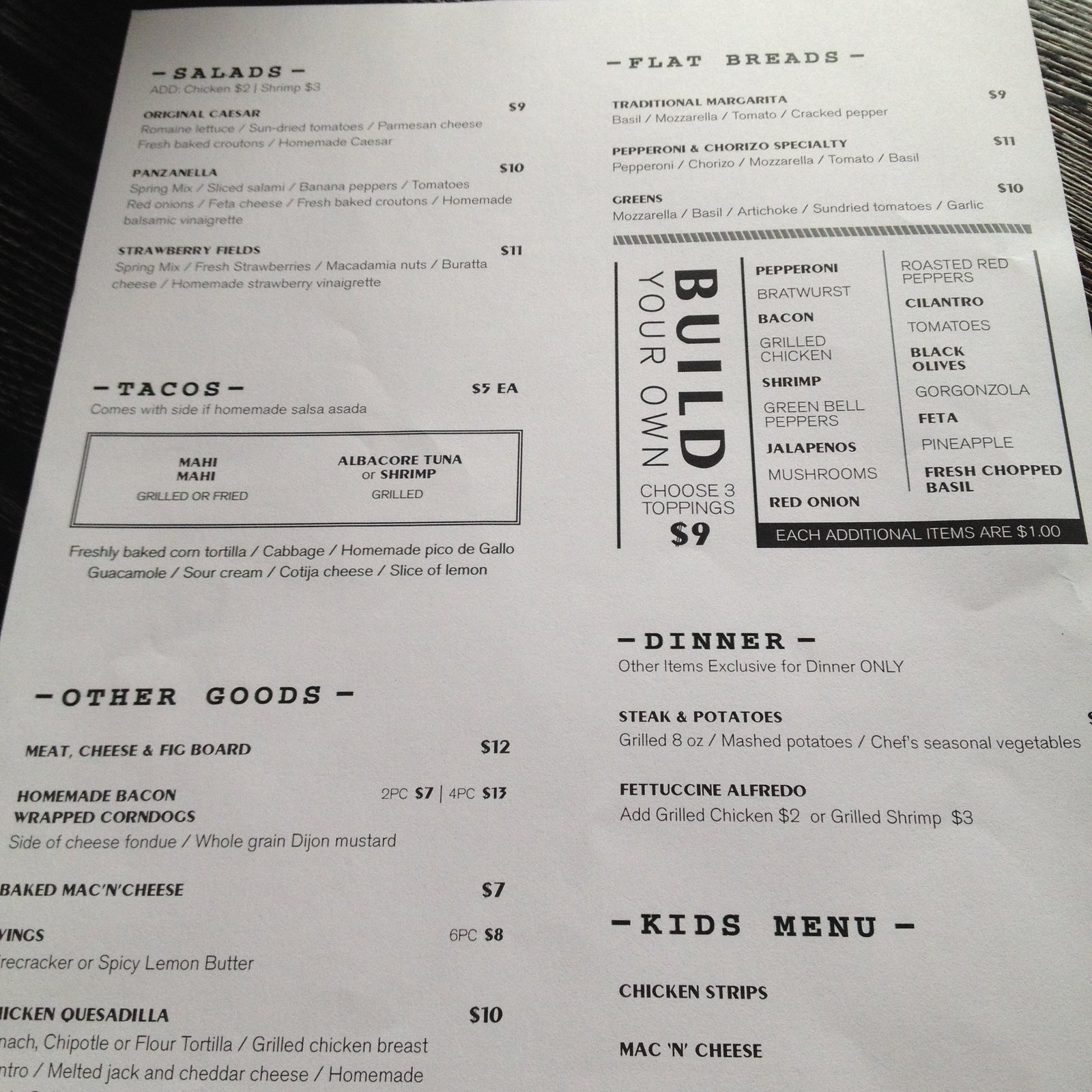 Other difficult choices were deciding what we wanted to try on this visit (while planning what we want to try on future visits…did you notice there is breakfast…daily breakfast, not just a weekend Brunch…). So, the "Greens " flat bread ($10) was our mutual choice. Fresh made chewy (with a bit of bottom crunch) flatbread topped with Mozzarella, sun dried tomatoes, artichokes, fresh chopped garlic and basil…the flavors all melded wonderfully and went well with each beverage choice.