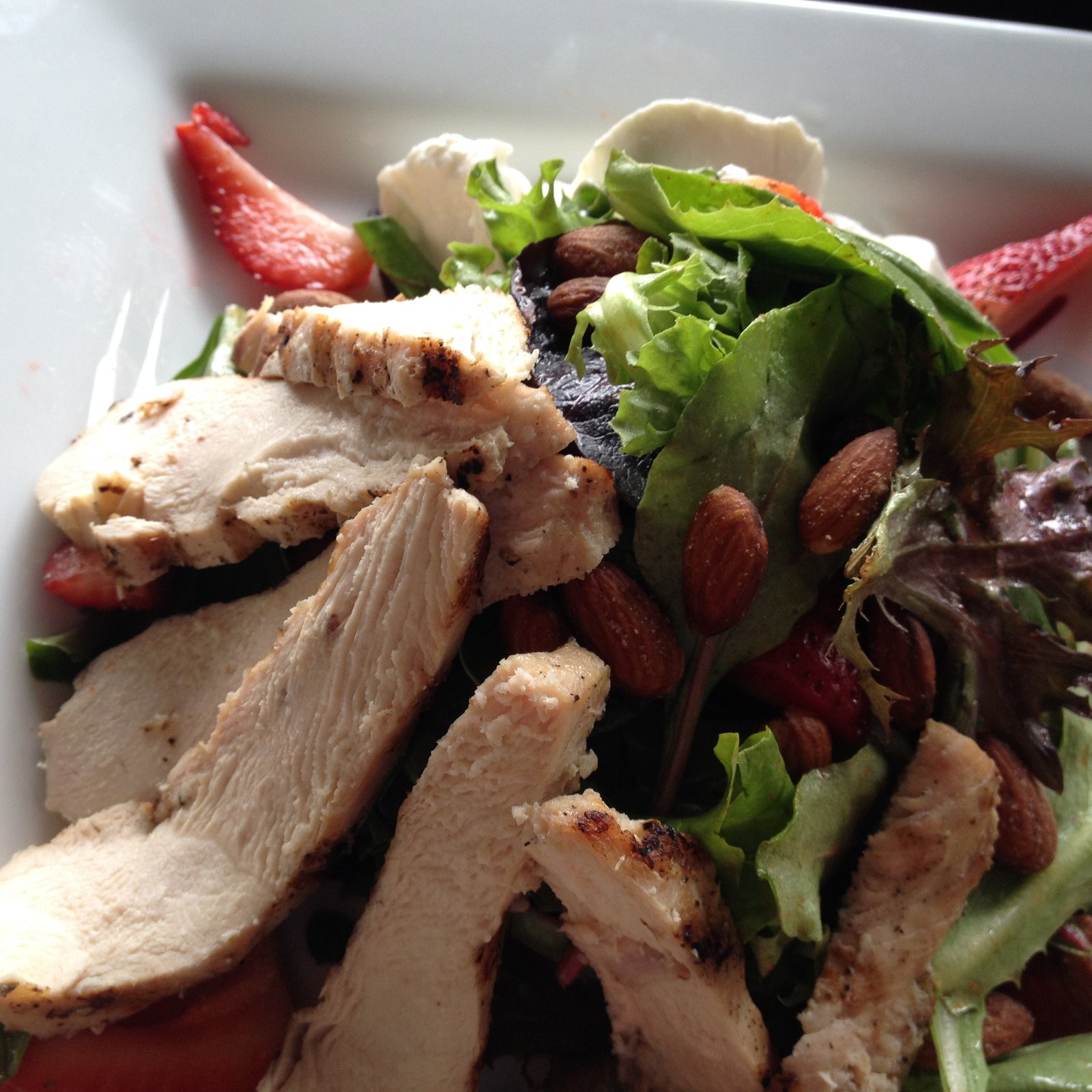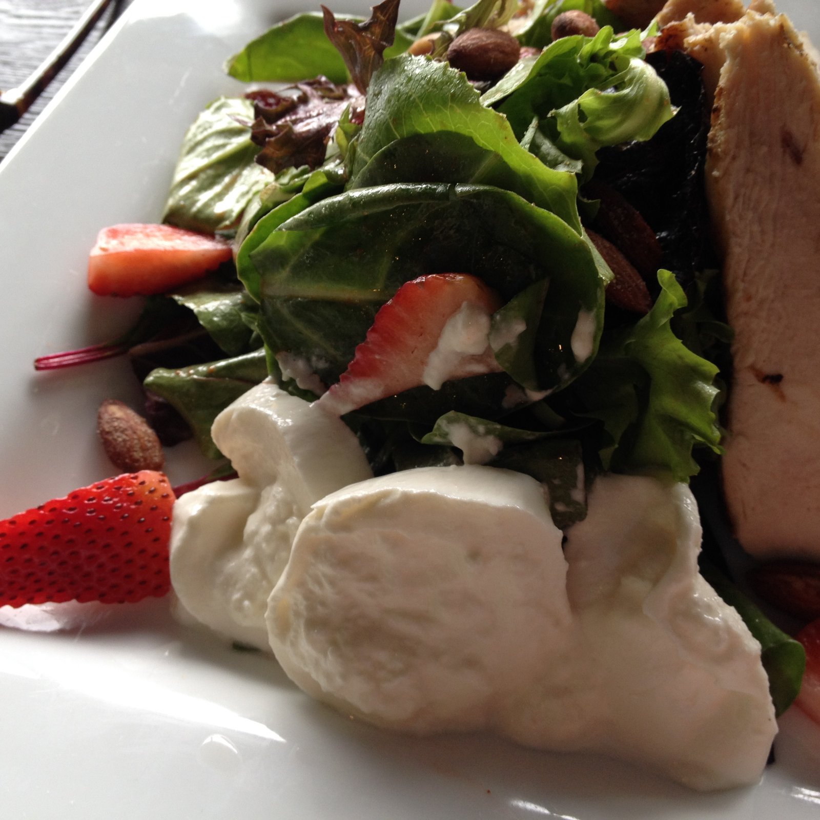 This quite large (despite the photo) "Strawberry Fields" salad ($11) with added chicken ($2) was also a mutually decided choice, primarily because of the cheese –Burrata– and our general tendency toward trying to have a 'balanced' meal. Spring mix greens, whole almonds and a very nice strawberry vinaigrette combined with the Burrata and good portion of warm/just cooked marinated chicken (the flavors of the chicken were good enough not to need any seasoning additions) made this salad an excellent meal…well, half the salad plus half the flatbread was a great meal.