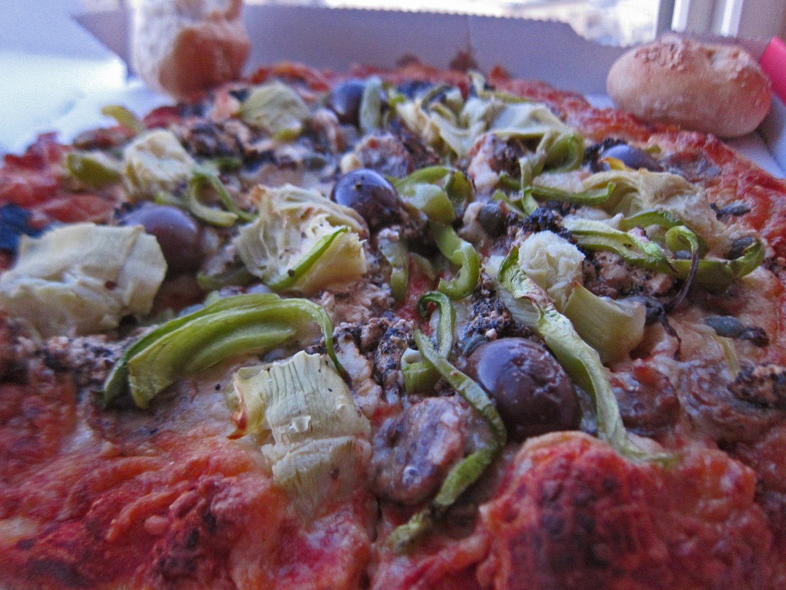 The pizza…the crust was quite nice….had artichoke hearts, olives, and a nice tangy tomato sauce.