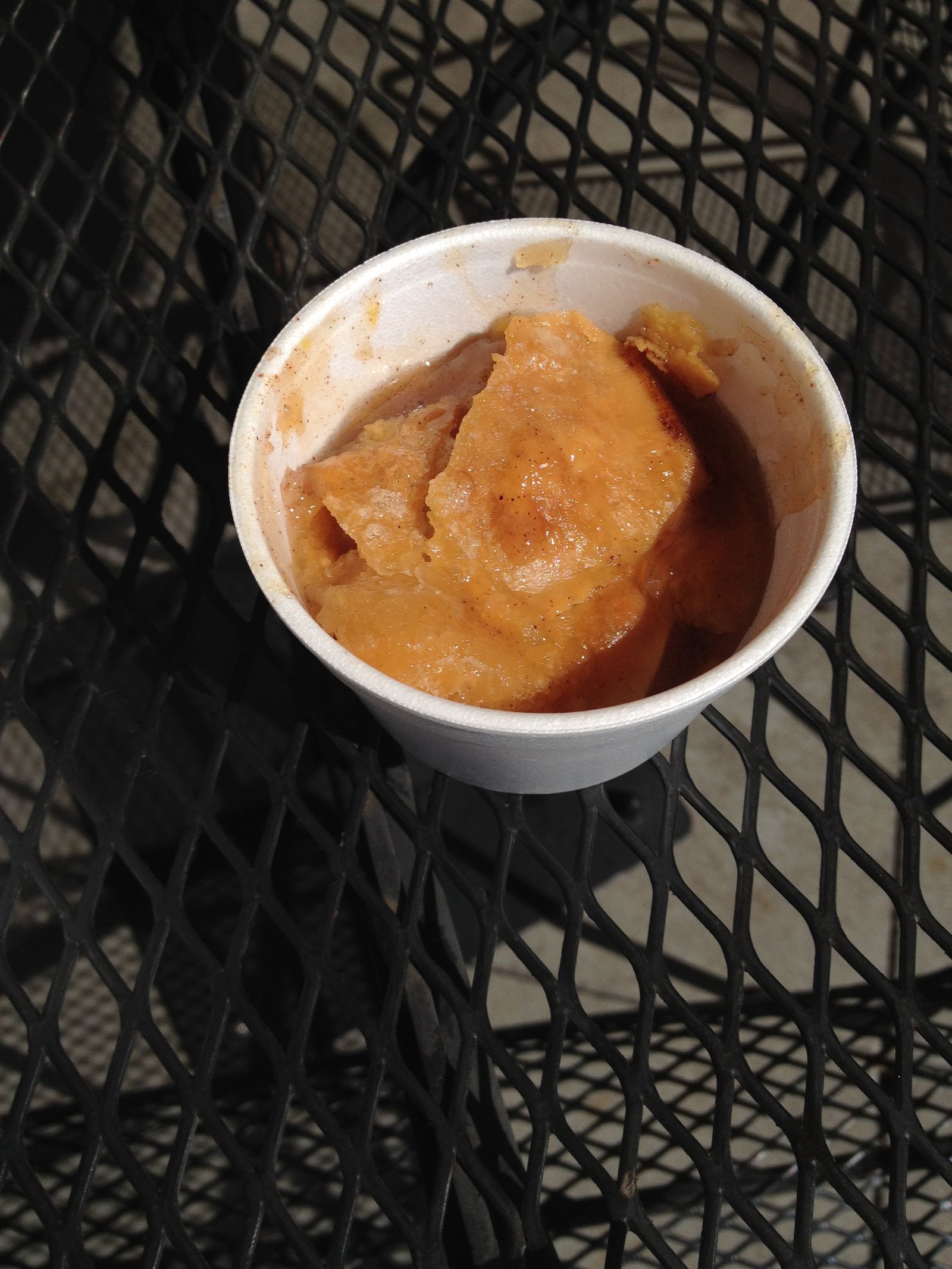 There was rice in the bottom of the container, topped with this wonderful Creole stew that had the flavors of the mirepoix of celery, green pepper and onion combined with not an overpowering of filé/sassafras powder which melded with the chicken and sausage in such a delightful, hearty way. This Gumbo was a meal in itself, and would be perfect on a rainy day.That first visit, so early in the morning and uncrowded, had the gentlemen behind the counter offering us a sample of the fresh made peach cobbler. We were so full, and took it home for a snack later that day. The crust was still crispy (a good sign) and the peach filling was not too sweet at all.