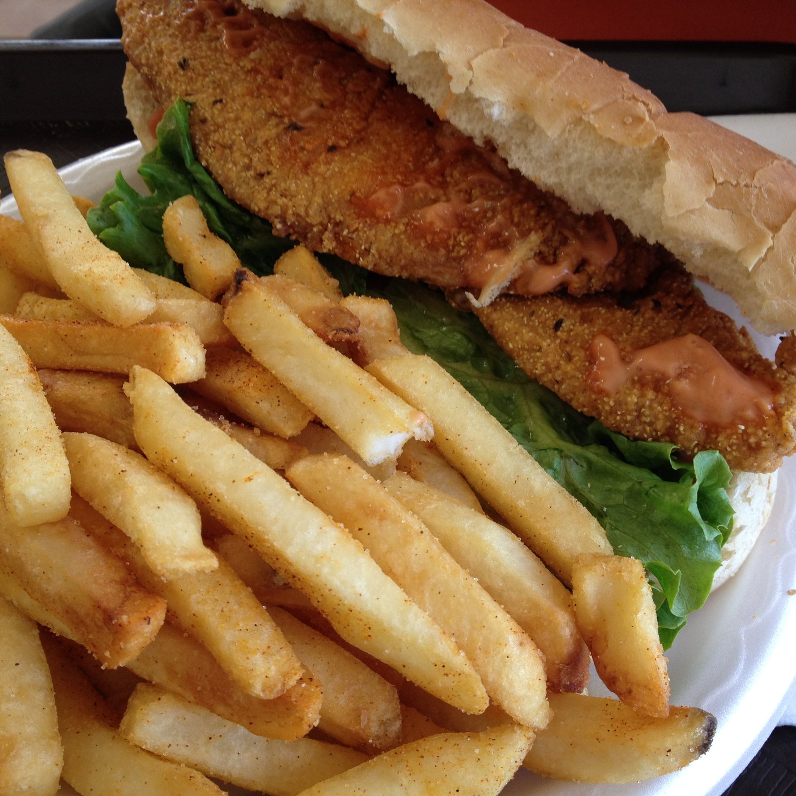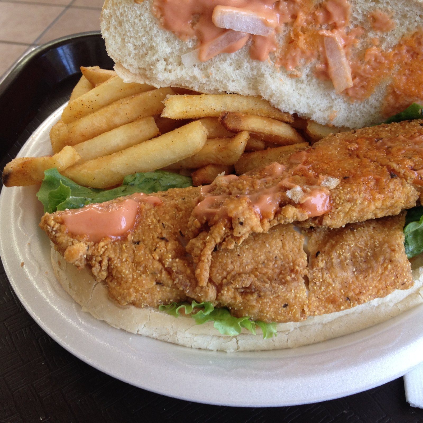 Our return visit had us curious about the "Fantastic Fish Sandwich" (combo,$7.25, includes fries and a drink). There was a choice of catfish, snapper or tilapia as the fish. Catfish it was! Wonderful cornmeal breading, seasoned and fried, topped with a house made remoulade and some raw onions, on a very nice, fresh French roll (crispy crusted exterior).