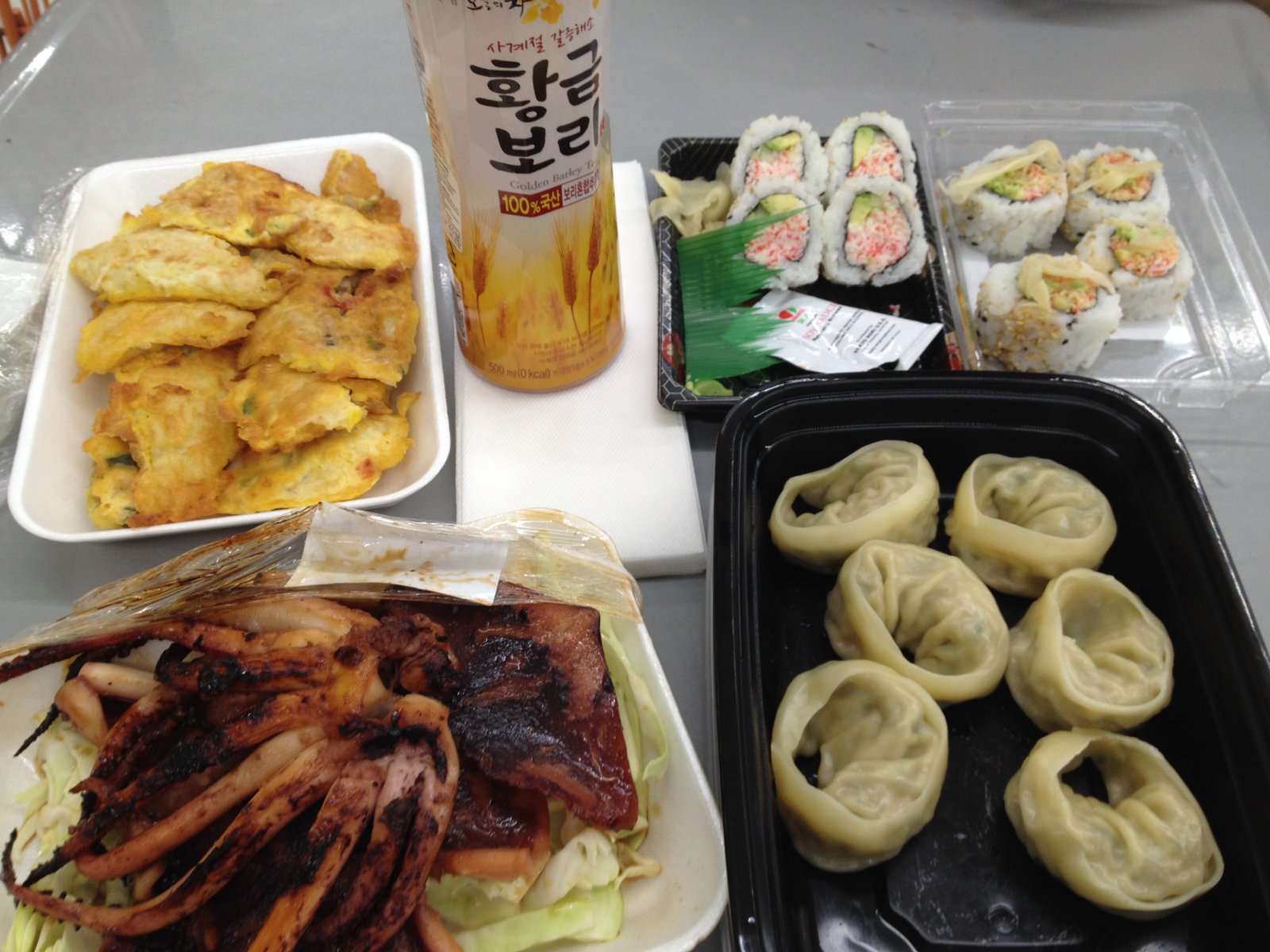 Clockwise from 11:00—Fish pancakes ($4.54), barley tea ($1.50), real crab California rolls ($3.25), kimchi steamed dumplings ($3.75) and a whole teriyaki grilled squid ($4.99).