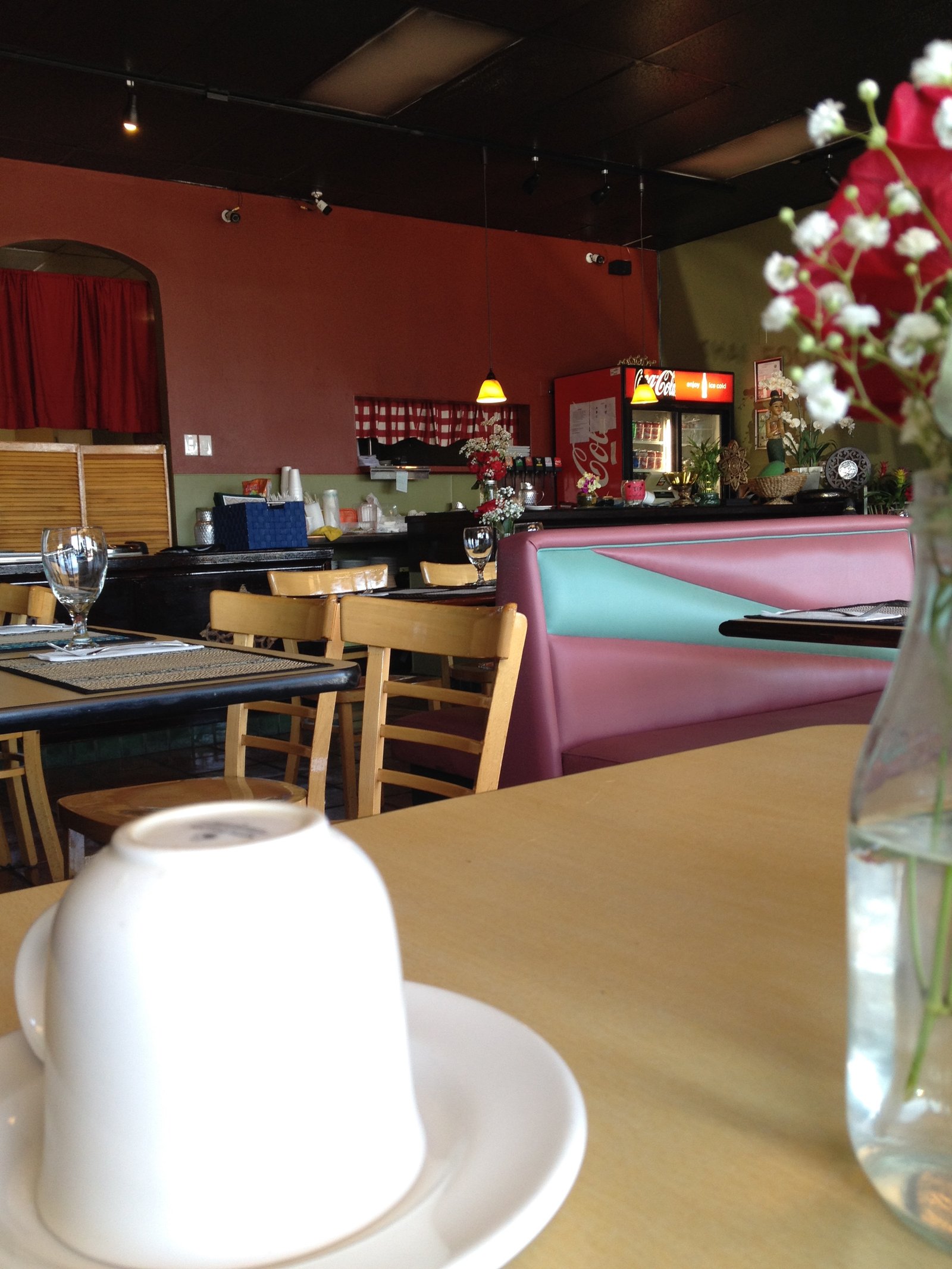 Almost two years ago, Bua Thai Kitchen opened in this location, it formerly had been three iterations of a Taco Shop. The Southwest corner of Mission Gorge Road at Cuyamaca is anchored by a McDonalds, two banks, a 99Cent Only store, Bevmo and Petco has a large parking lot to accommodate all of the business here.