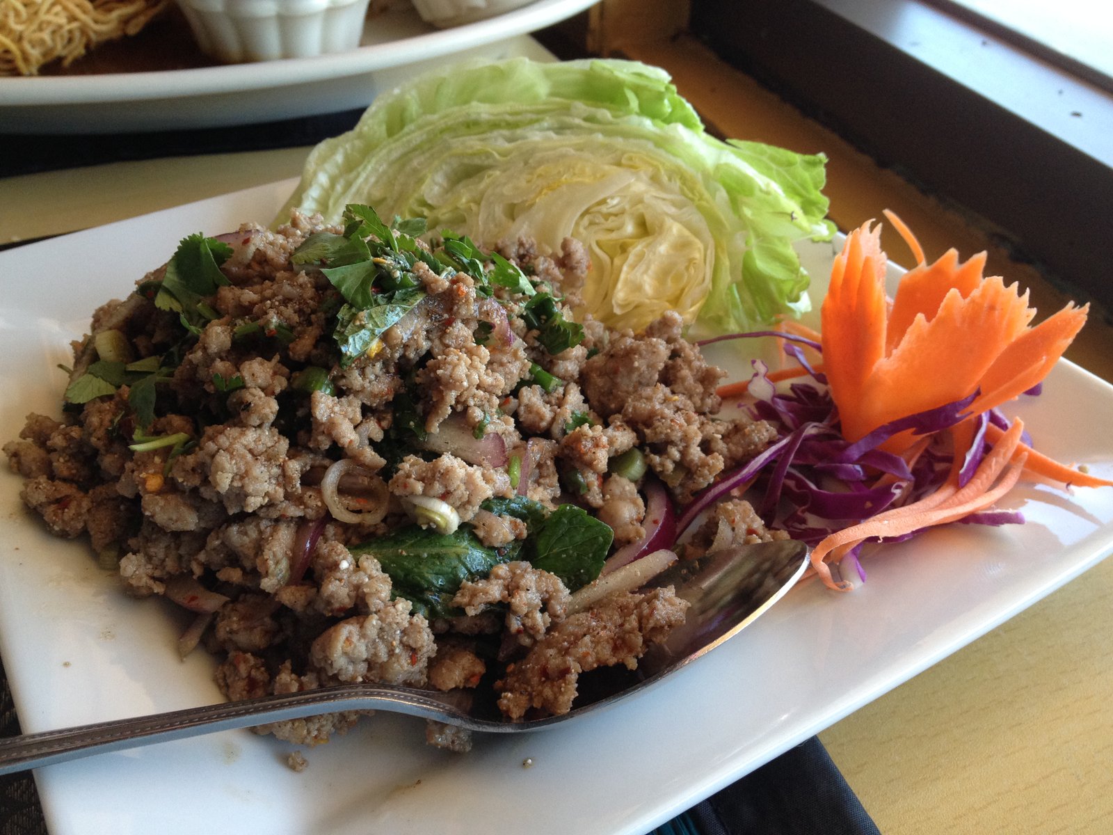 Once I knew Bua was in the kitchen, I also ordered the pork larb ($8.95) (also at a heat level of 4/10) and it was as I remembered: perfect…the crunchy rice powder, the mint, the perfect heat level. My cravings for this simple dish have returned.