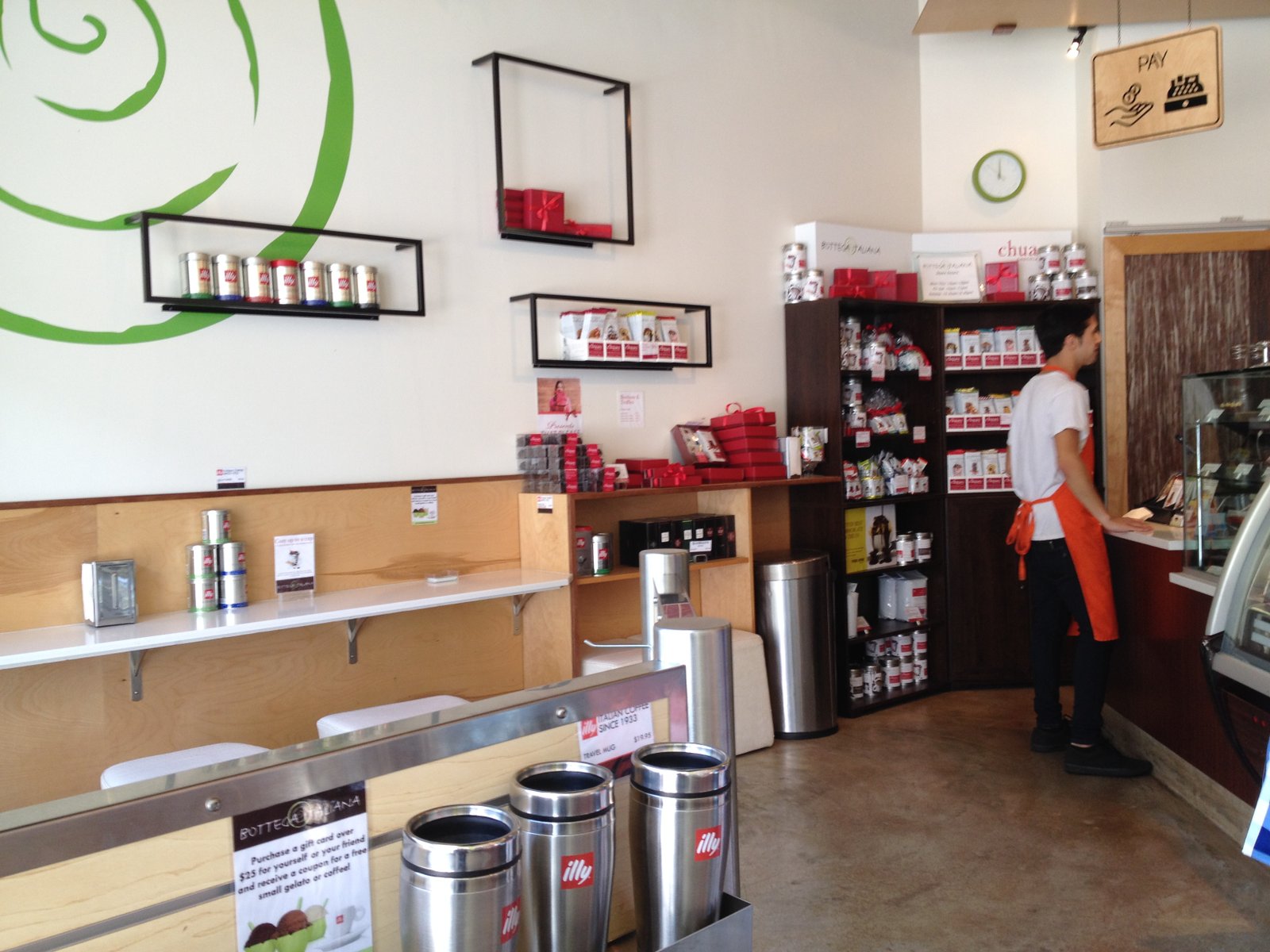Kirbie visited in January. cc visited the other (Coronado) San Diego location selling Bottega Italiana gelati in November. Faye also mentioned Bottega Italiana in the middle of this post. There is an area selling coffees and San Diego made Chuao Chocolates to take home.