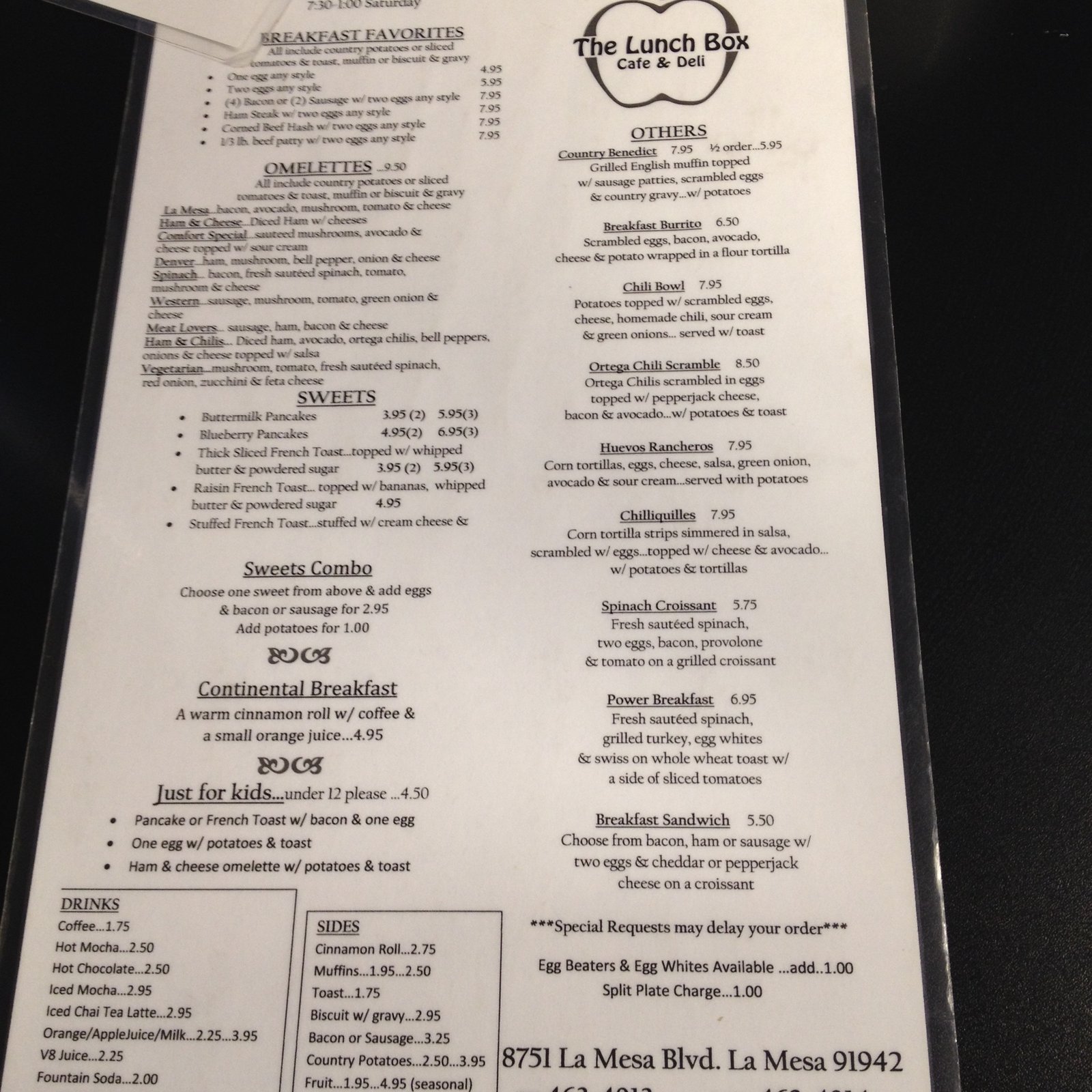 The Lunch Box Cafe & Deli 8751 La Mesa Blvd La Mesa 91941 (619)463-4013 Open Mon-Fri 7:30-2, Sat 7:30-1 Closed Sunday