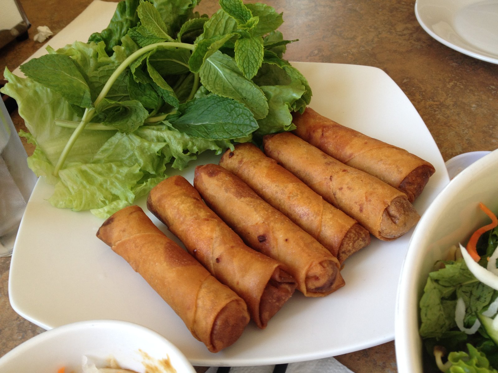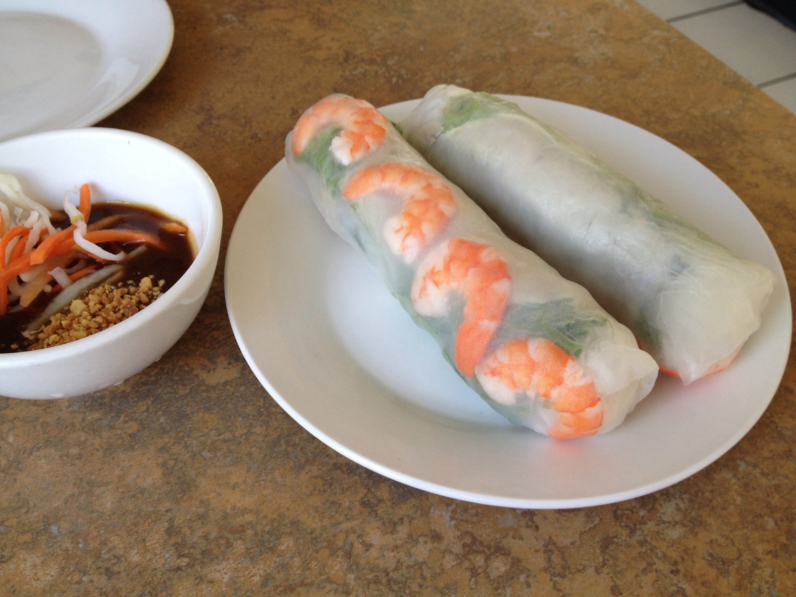 Ordering at the restaurant means the rolls are even fresher than the ones delivered to those stores daily. I must say the rice paper wrap is never 'rubbery', because the rolls are just made. There is only one choice of flavors- shrimp with pork. ($3.25). The fresh vegetable fillings(lettuce, mint, cucumber, carrot, daikon) are refreshing and what I crave. The peanut butter based dipping sauce lends a good umami to it all.