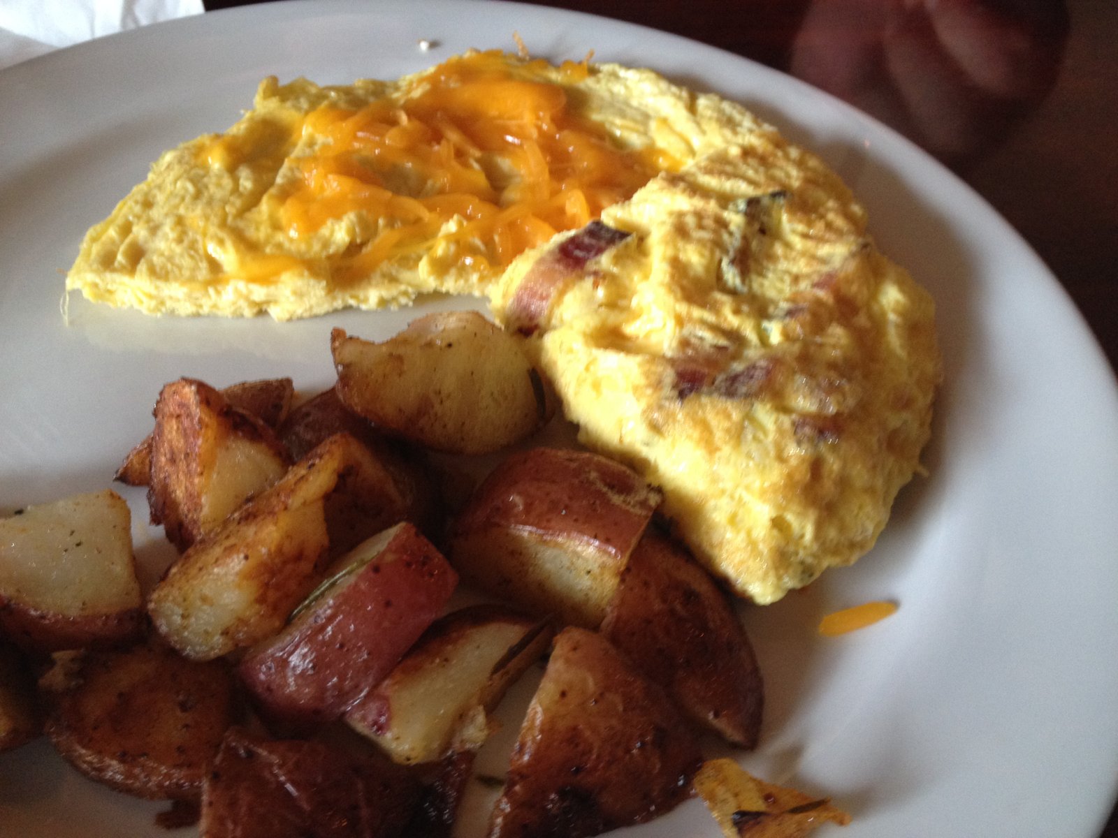 Bacon-Cheddar omelet ($9.50) comes with a fruit cup, oven roasted rosemary potatoes and slices of fresh baguette. The three egg omelet is made in a way we are now going at home. The bacon (smokey and thick pieces) seems to have been in the pan first, with the whipped eggs placed over those pieces, then cheese is placed on top of the cooked eggs and then folded, resulting with cheese in the middle and bacon on the outer edges of the fluffy omelet.