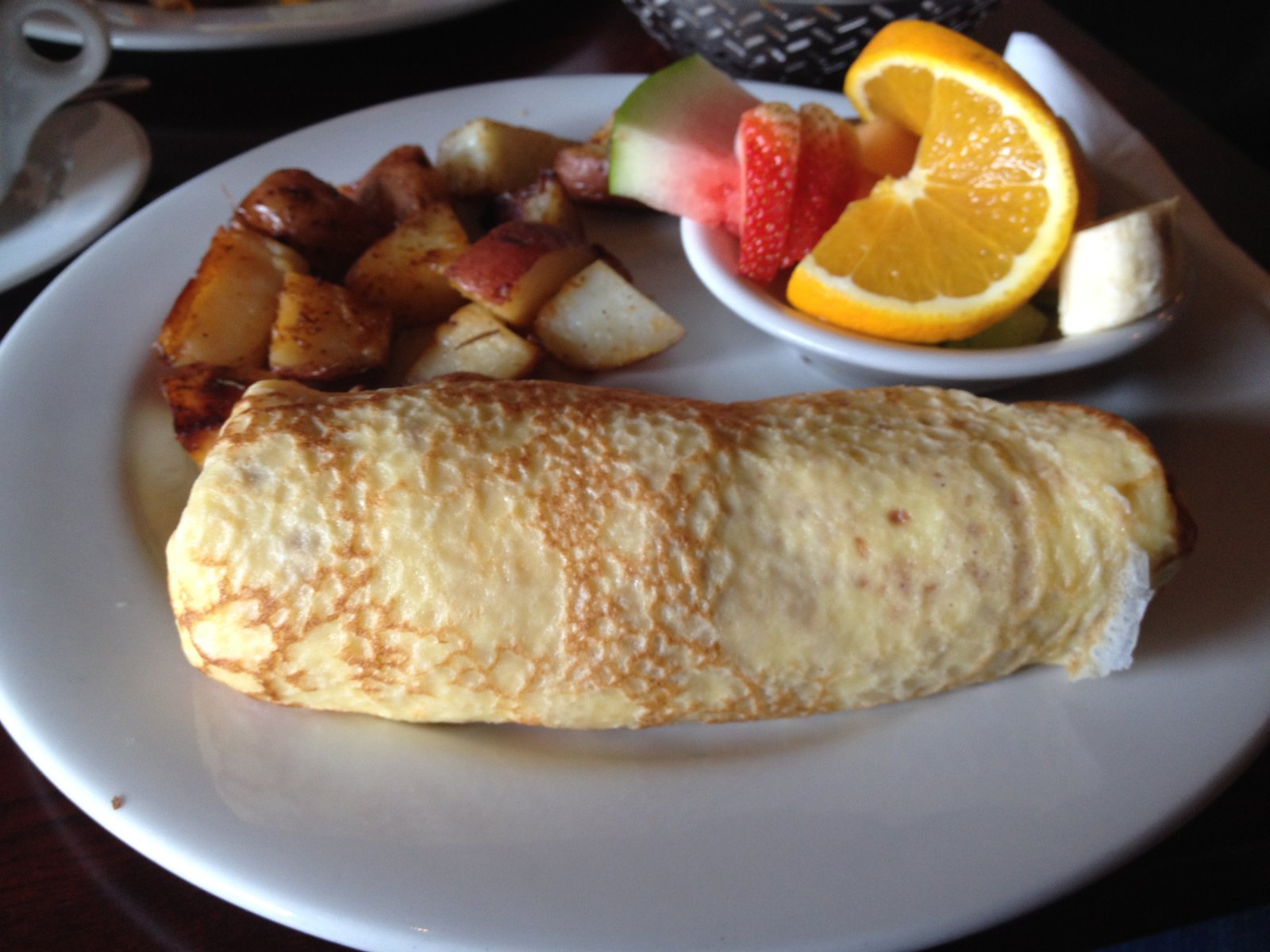 Ordering the Meli-Melo crêpe ($8.50), I wasn't expecting much. The menu description of 'two crêpes filled with scrambled eggs and melted Swiss' seemed generic. Wrong! The perfectly cooked, slightly sweet extra large (instead of two) crêpe was packed solid with softly scrambled eggs smoothly mixed with a nutty tangy Swiss cheese. Those sides of a fruit cup and rosemary roasted potatoes made this quite a large meal.