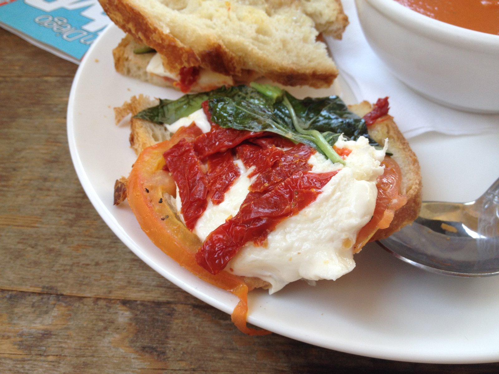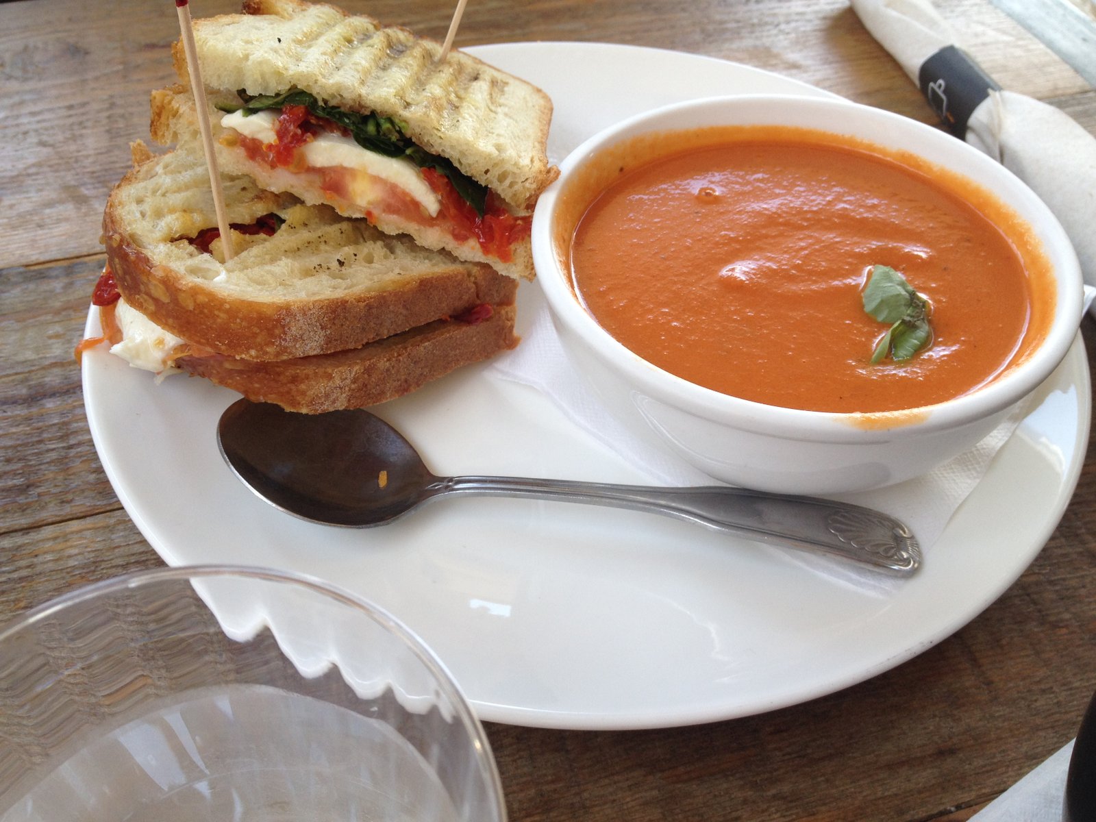 The Mister ordered a Caprese Panini ($7.95)- roasted and sun dried tomatoes, fresh Mozzarella and (giant) basil leaves on grilled sourdough, along with a bowl of tomato soup (add $1).