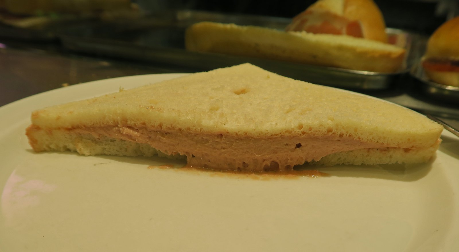 The Missus actually enjoys the less salty, leaner,  more meaty cured pork loin (lomo). This was a nice 06072015 083little brunch item for us. I also noticed something on the menu board behind the counter. Under the heading "Sandwichs". Yes, not "sandwiches", but "sandwichs", the "crema" category were the words "foie gras". For .9 Euros, basically a buck. I had to try this…..