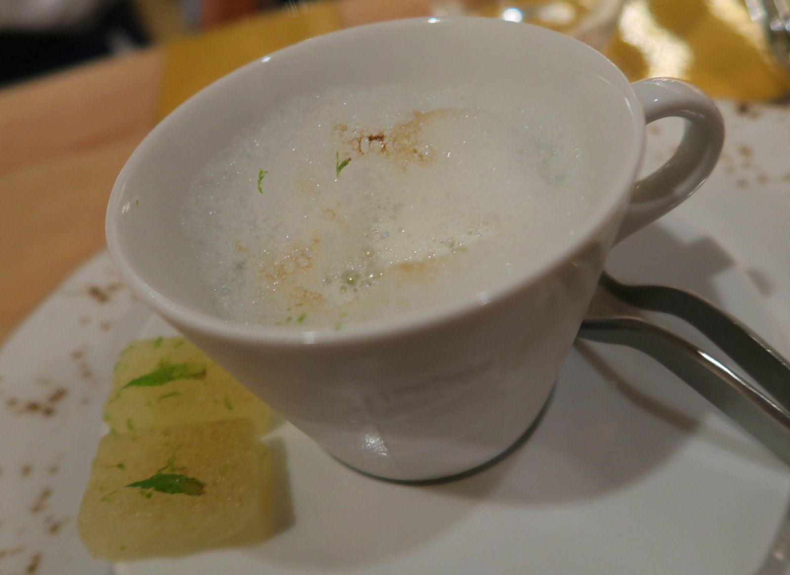 Things started with a foamy Melon Caipirinha, Liquid was poured into a cup of ice, yielding something that frothed up and was nice, with the jellied melon-mint-salt cubes rejuvenating your tastebuds.