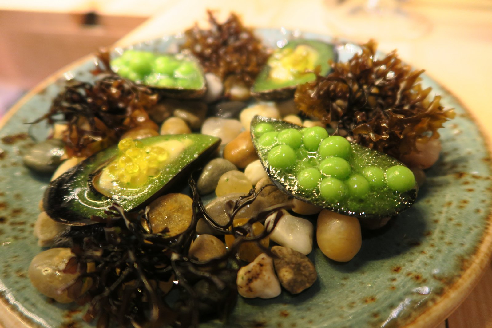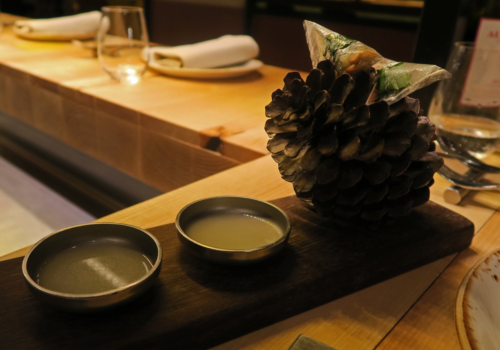 The restaurant looks fairly small from the outside but the dining area is actually quite large. We had arrived at about 8pm, pretty early in Spain, but were relieved to see at least two parties had arrived before us. Being led to our seats, the Missus had a stroke of genius….She asked if we could sit at the bar instead, which is actually the dessert prep area. We were cheerfully accommodated. Like Suzunari and Wakuriya, sitting at the bar watching the food being prepped with precision and skill is a treat.
