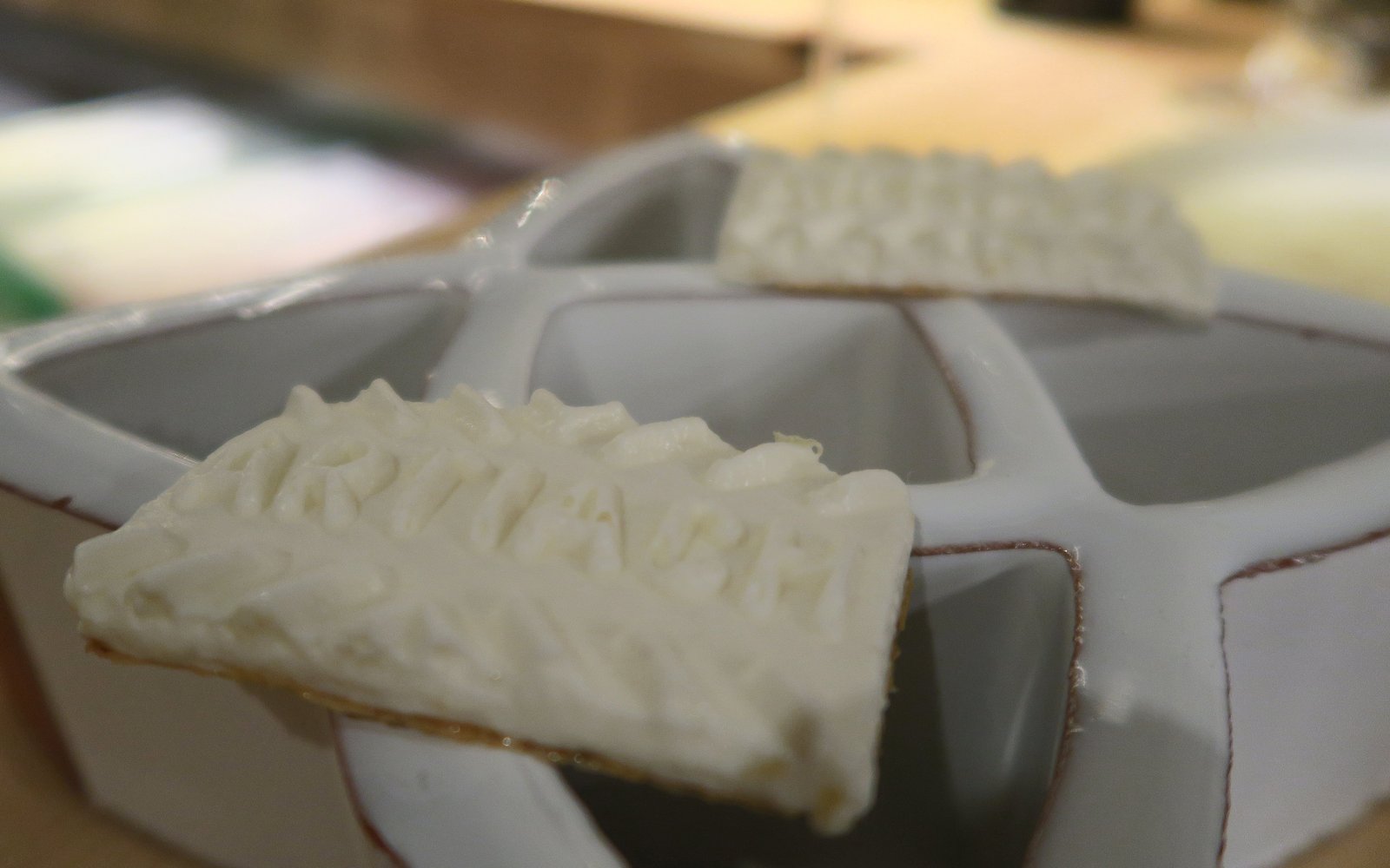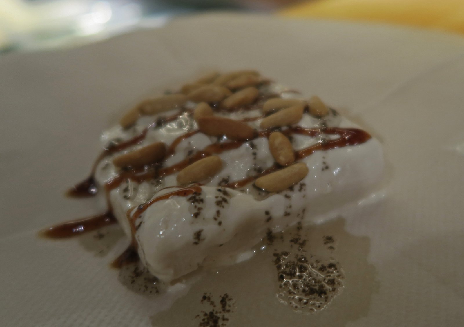 Made from oblate film, the stuff folks use to help them swallow meds, is used as a wrapper for pine nuts and basil. It is dipped into a parmesan jus, the wrapper starts melting and basically melts away in your mouth. Nice flavors of pine nuts and parmesan.