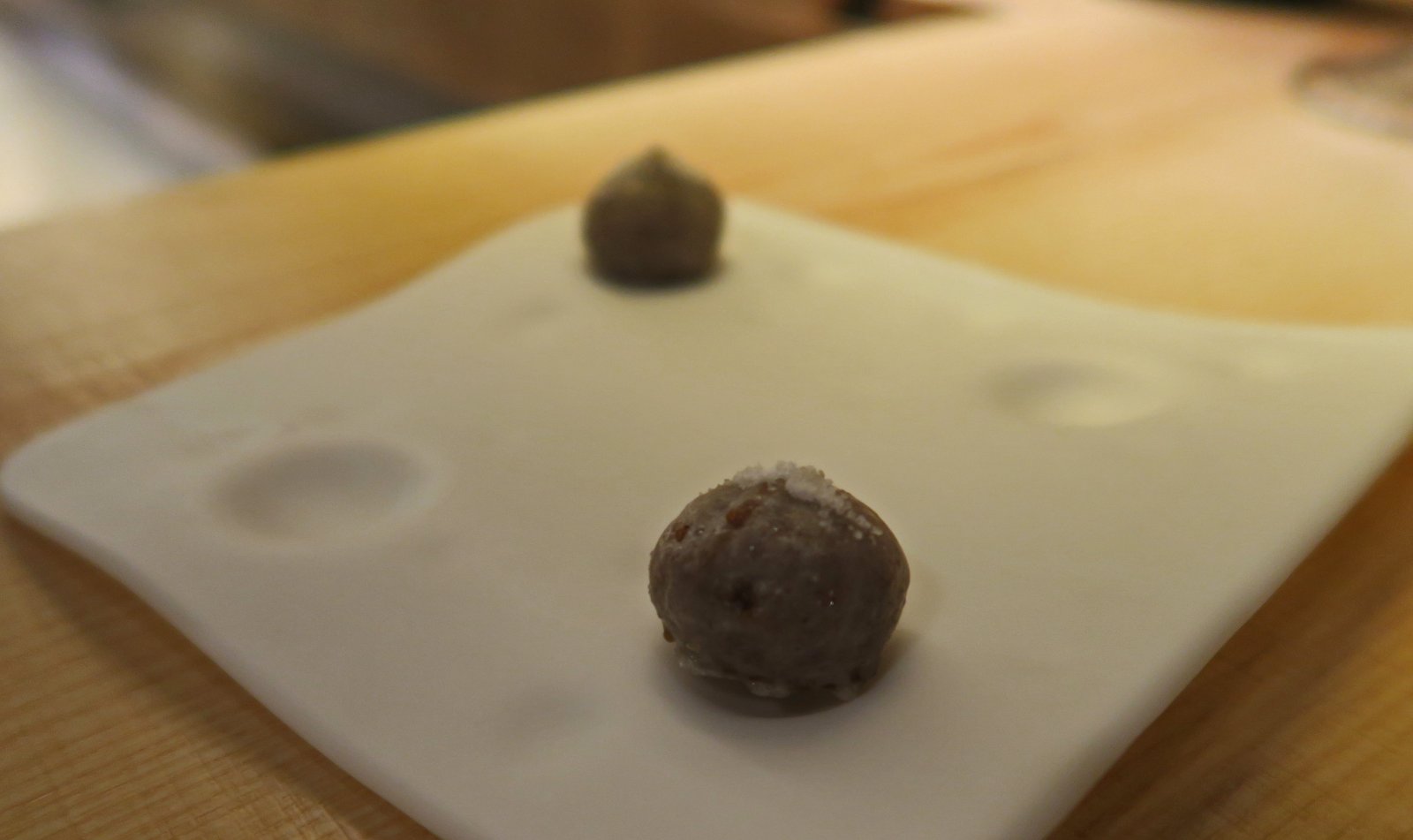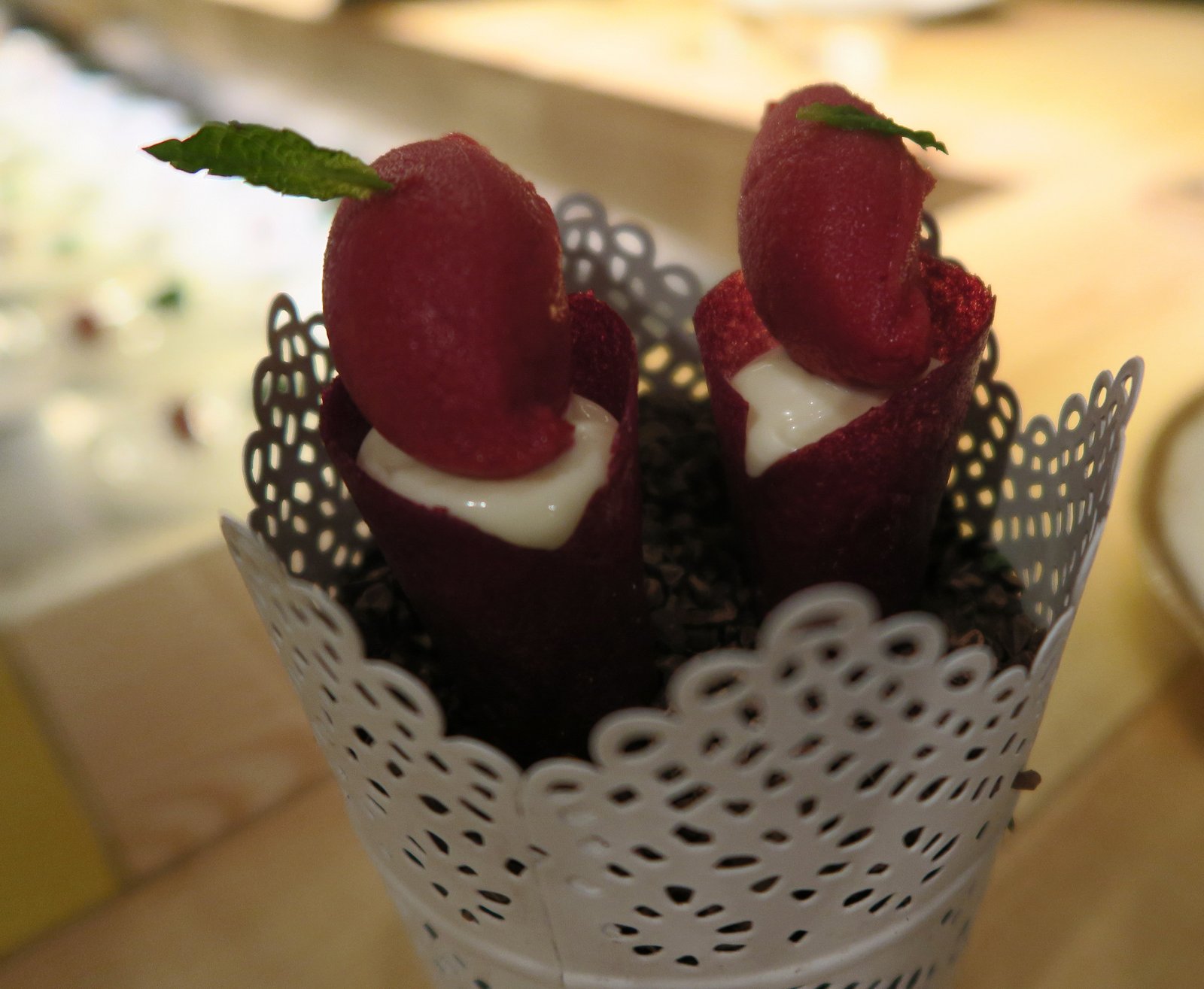The balls were light and crisp, the flavor of intense beets coming through. The Missus, who has several times told me; "I hate molecular gastronomy" was sold! This is what I call soulful transformation. We were actually shown how this was made. A beet meringue was created, then dehydrated.