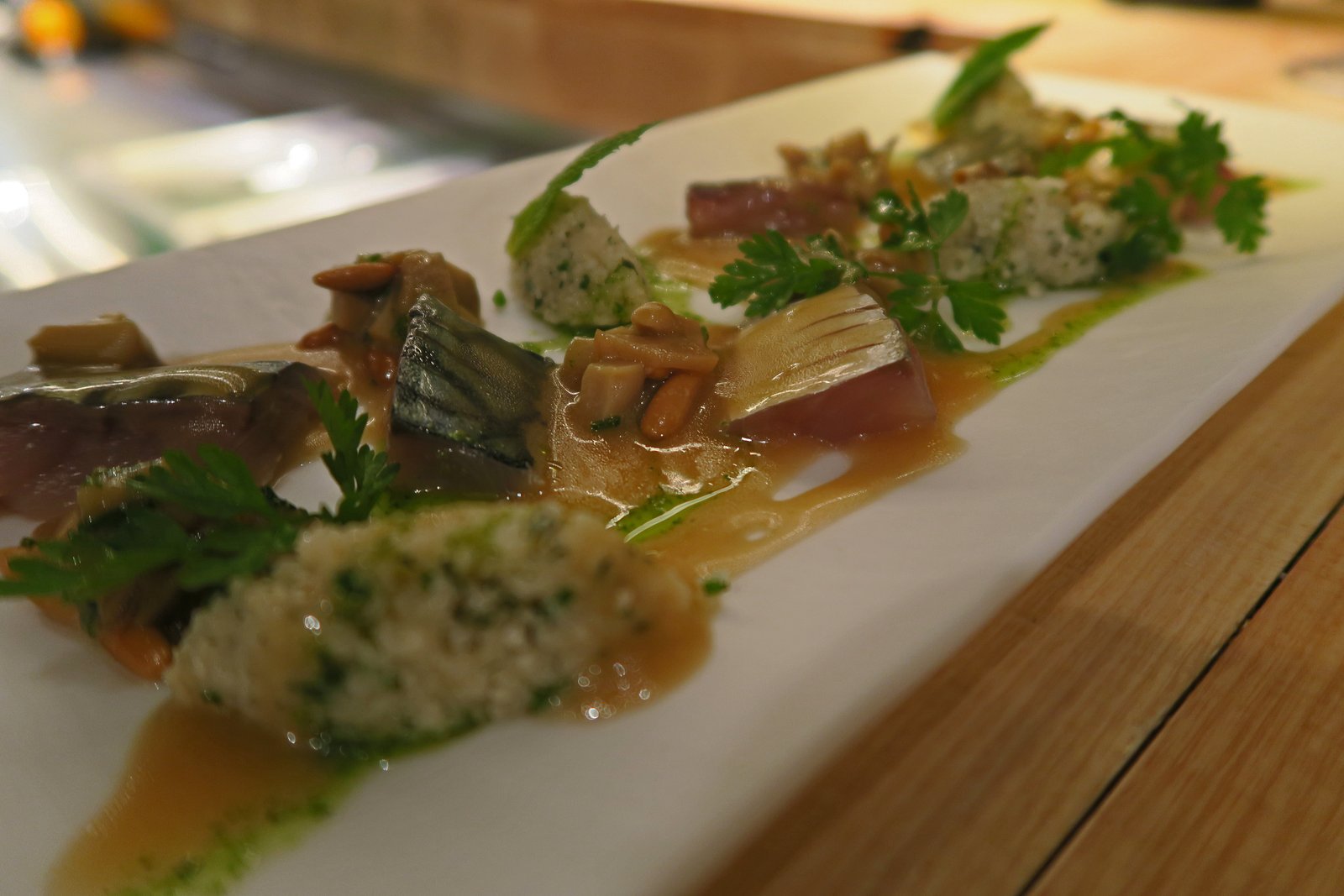 The Missus was really worried about the Marinated Oily Fish with Cauliflower Tabbouleh and Mushrooms. First, She's not a big fan of mackerel and also not fond of strong parsley flavor.