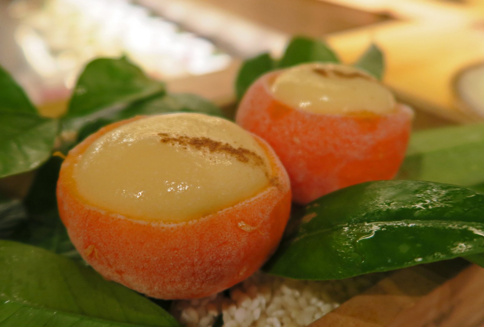 Spherification at work again. Two cocoa coated "olives", one contains a concentrated olive flavored liquid, the other a blood orange concoction. Amazing and intense flavors that just explodes upon breaking the cocoa butter crust.