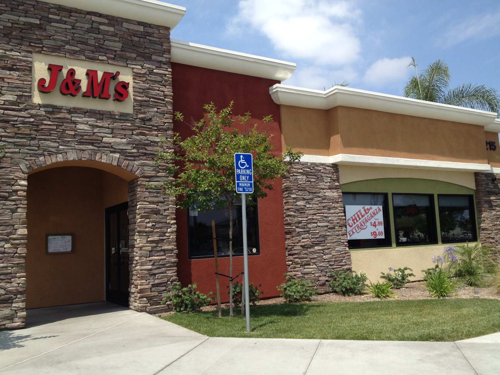 A few weeks ago, The Mister and I were headed to the Vallarta Market in Escondido, planning to eat lunch beforehand either in the store (link is about a different location of Vallarta; but the food court inside all stores have the same food selections) or at the Farmer Boys, which shares the same parking lot…However, seeing this signage at J&M's (also sharing the same parking lot)…well…had to stop.